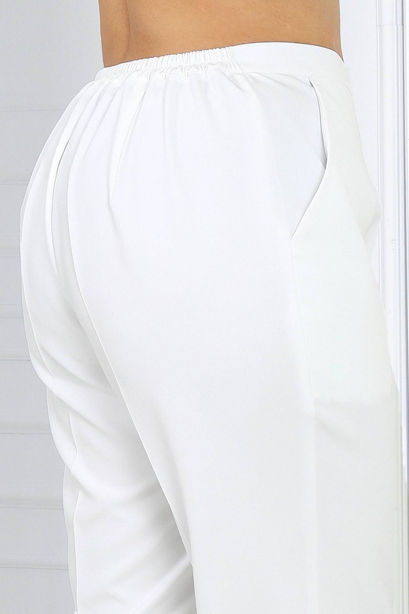 Брюки классические, с посадкой на талии, на притачном поясе, с застёжкой на тесьму-«молния», расположенную в среднем шве передних половинок, и 1 петлю и 1 пуговицу на поясе. Передние и задние половинки брюк с талиевыми вытачками, идущими от пояса вниз, с заутюженными стрелками, с боковыми наклонными карманами на передних половинках. Для лучшего прилегания брюк в области талии в поясе со стороны спинки вставлена резинка.