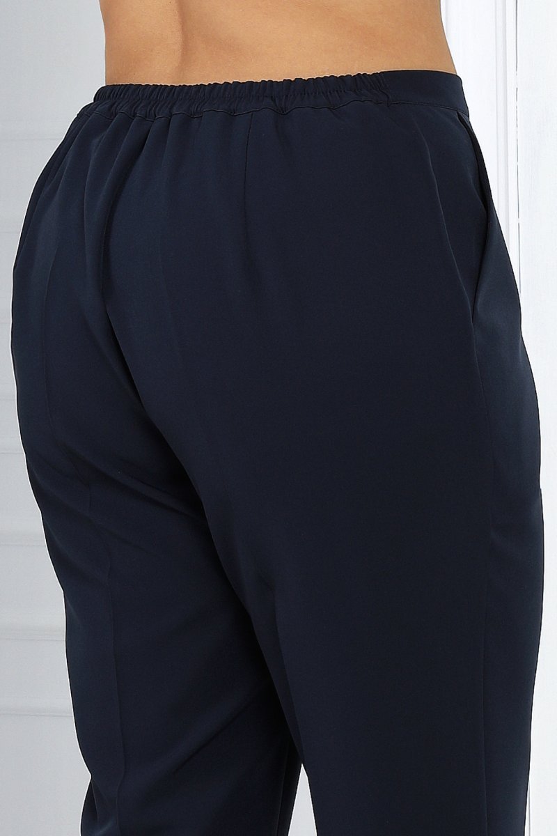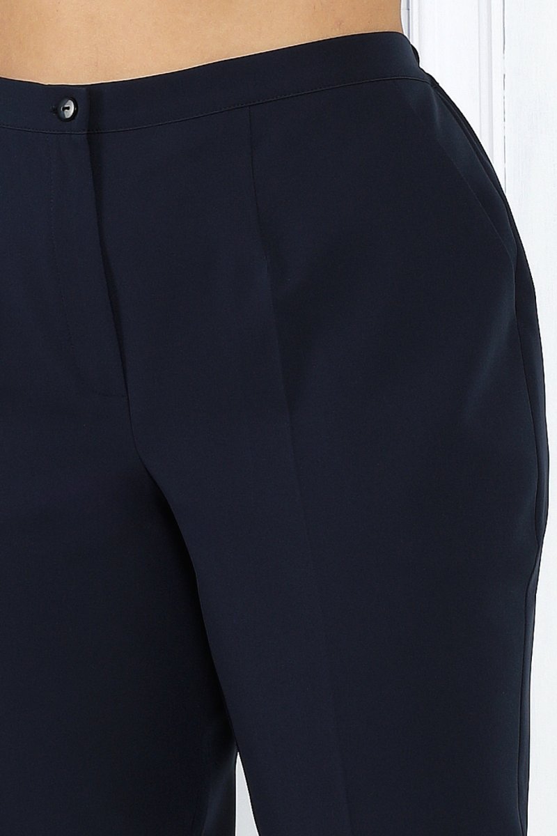 Брюки классические, с посадкой на талии, на притачном поясе, с застёжкой на тесьму-«молния», расположенную в среднем шве передних половинок, и 1 петлю и 1 пуговицу на поясе. Передние и задние половинки брюк с талиевыми вытачками, идущими от пояса вниз, с заутюженными стрелками, с боковыми наклонными карманами на передних половинках. Для лучшего прилегания брюк в области талии в поясе со стороны спинки вставлена резинка.