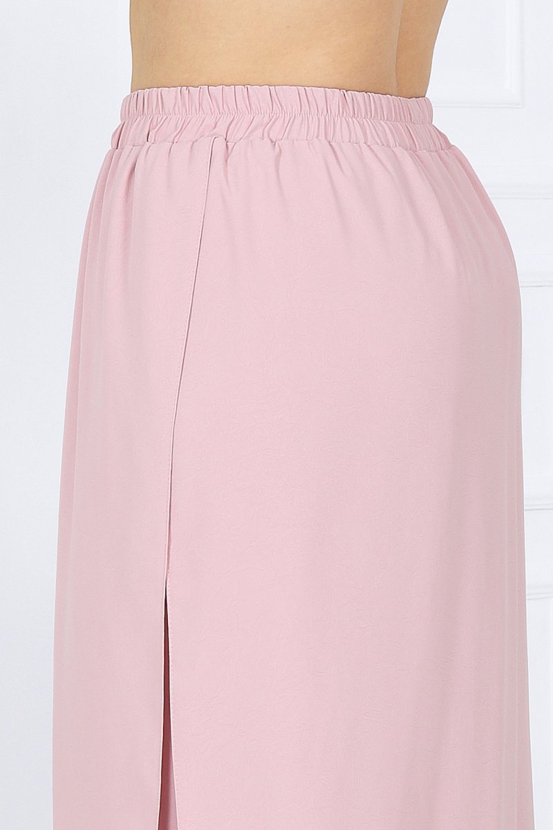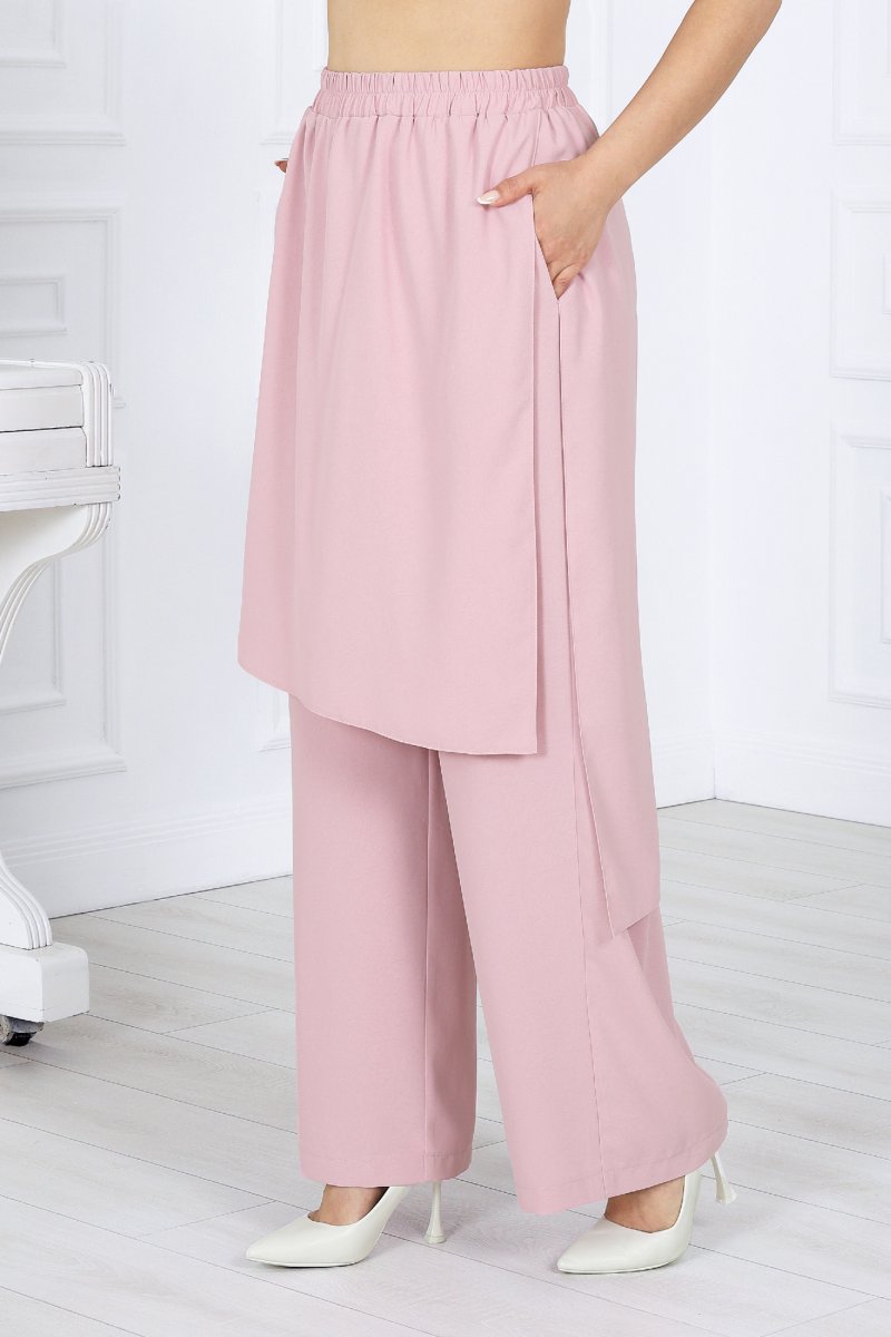 Брюки свободного кроя, длинные, с посадкой на талии, выполнены из крэш-полотна. Модель без стрелок, без застежки. В боковых швах обработаны карманы. Для лучшего прилегания по линии талии в притачном поясе предусмотрена эластичная лента, вставленная по всей длине. Брюки дополнены двумя отлетными ассиметричными деталями разной длины; направлены от шва притачивания пояса и скреплены на запах на уровне боковых швов. Длина брюк по боковому (с поясом) – 106 см (44-46 р-р), 107 см (48-52 р-р).
