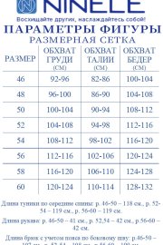 Туника А-образного силуэта, выполнена из шифона. Модель без подкладки и застежки, с плечевыми накладками. Низ туники асимметричной формы: укороченный спереди и удлиненный к центру спинки. Перед и спинка состоят из двух разных по длине слоев: верхний спереди короче нижнего на 4 см, а по спинке на 16 см. Горловина переда и спинки округлая, по переду слегка углубленная. Рукав, втачной, расширенный, с фигурным низом. Длина туники (по середине спинки) – 118 см (46-50 р-р), 119 см (52-60 р-р); длина рукава – 41 см (46-50 р-р), 42 см (52-60 р-р).