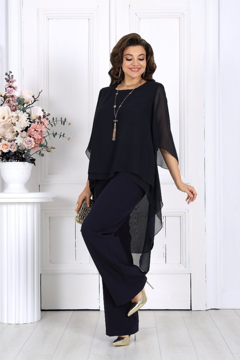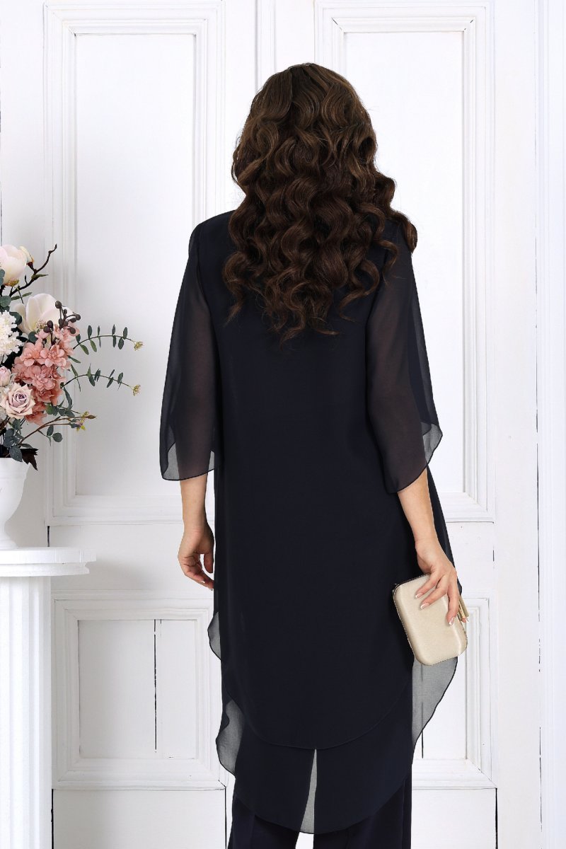 Элегантный брючный костюм – идеальный выбор для вечернего выхода, торжества или особого случая. Легкая шифоновая туника с асимметричным кроем и струящимися рукавами добавляет образу воздушности и утонченности. Удлиненная спинка делает силуэт элегантным и зрительно вытягивает фигуру. Прямые классические брюки из костюмной ткани великолепно садятся по
