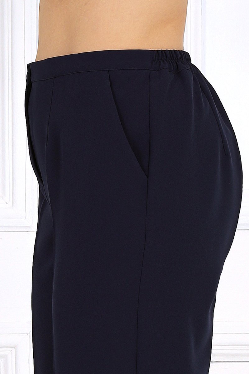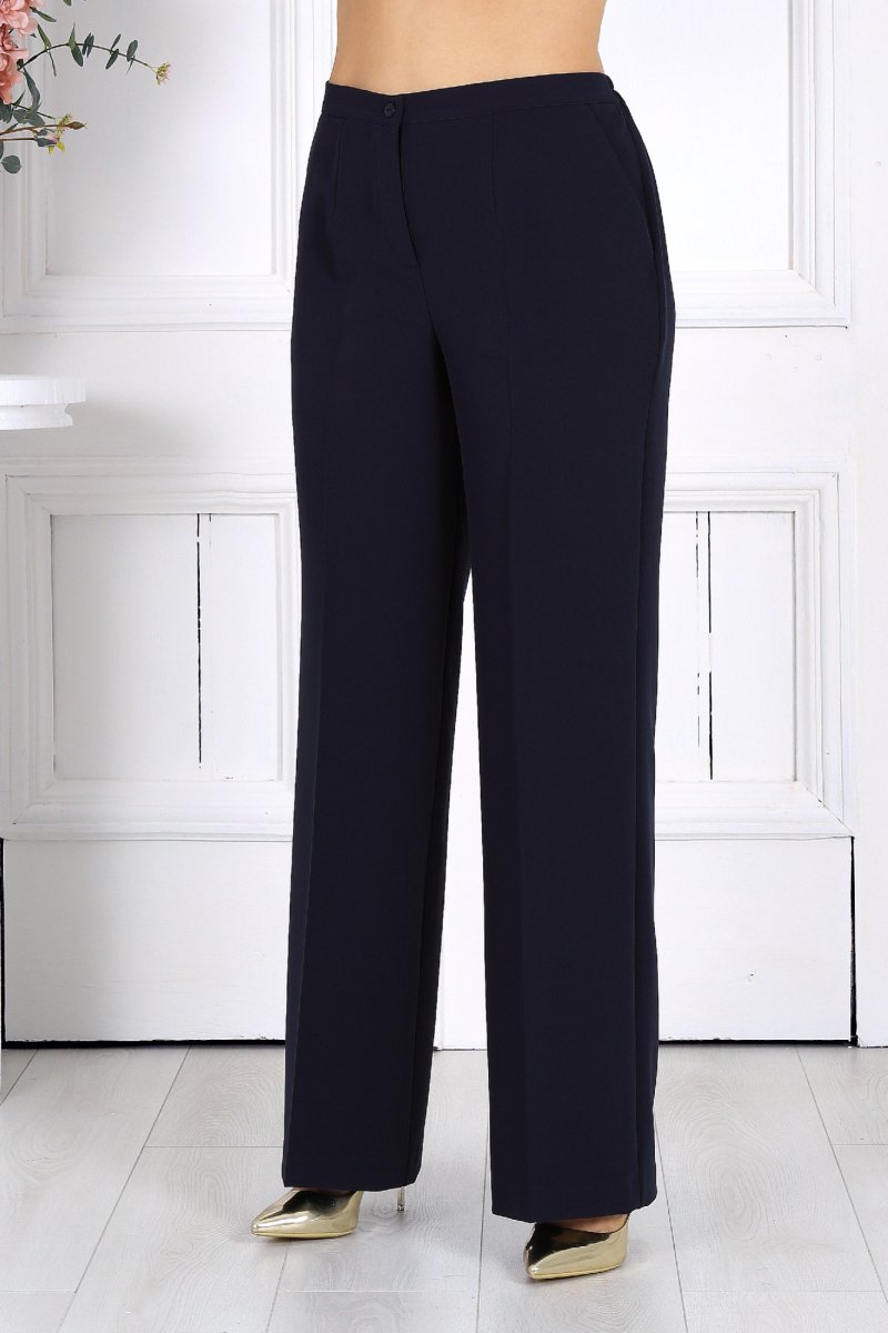 Брюки классические длинные, прямого силуэта, с посадкой на талии, выполнены из костюмно-плательного ткани. Модель с центральной застёжкой на тесьму-«молнию», на притачном поясе, застегивающемся на петлю и пуговицу. Передние и задние половинки брюк с талиевыми вытачками, направленными от пояса вниз. Спереди обработаны боковые наклонные карманы. Для лучшего прилегания брюк в области талии в поясе, по задним половинкам вставлена эластичная лента. Длина брюк по боковому (с поясом) – 107 см (46-50 р-р.), 108 см (52-54 р-р), 109 см (56-60 р-р).