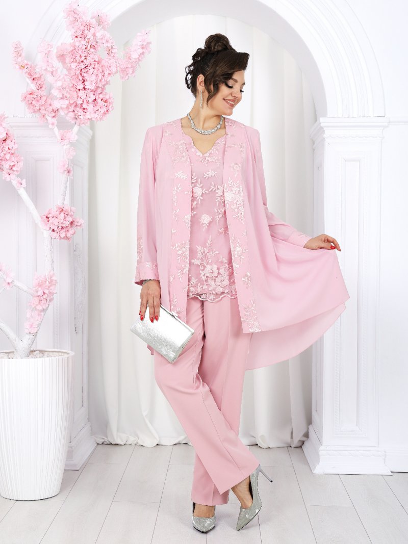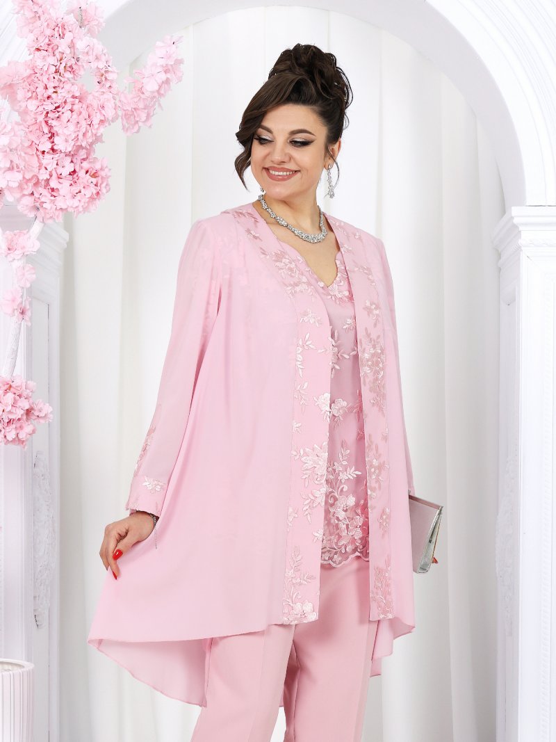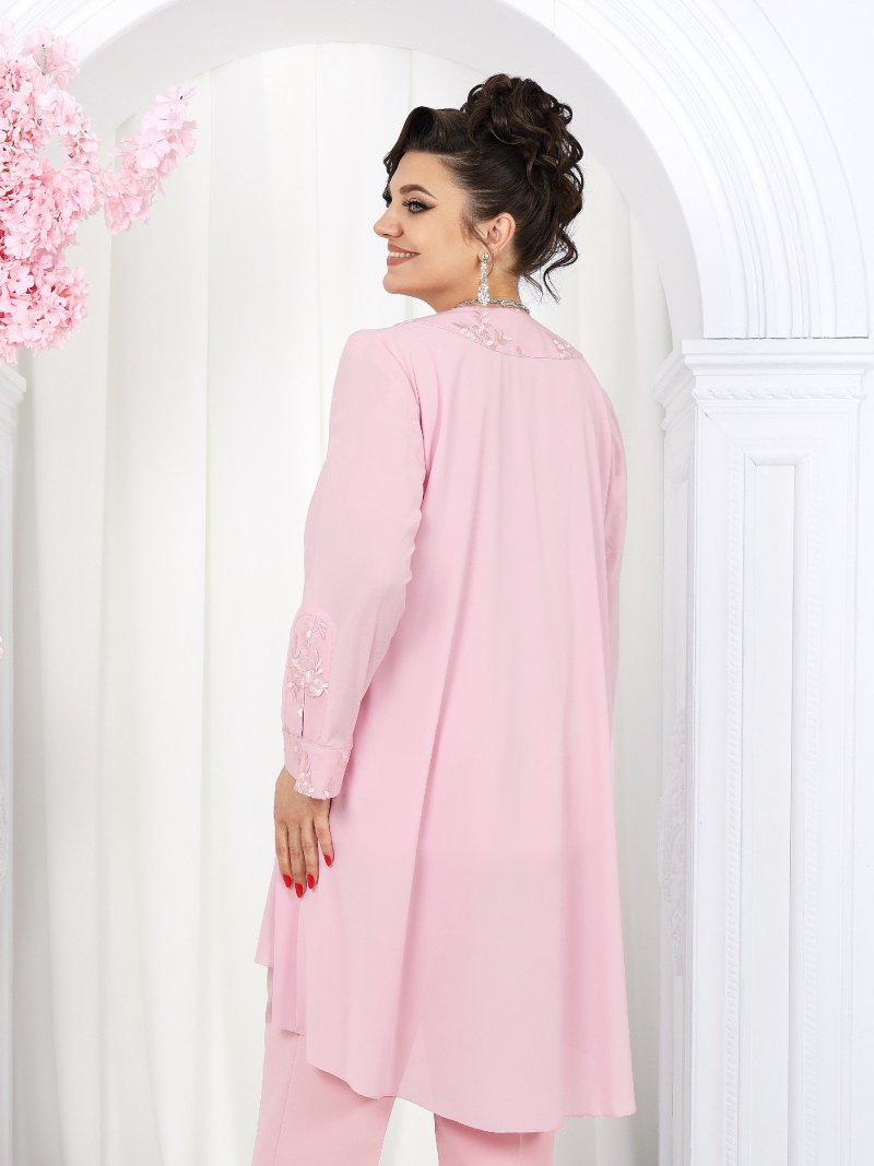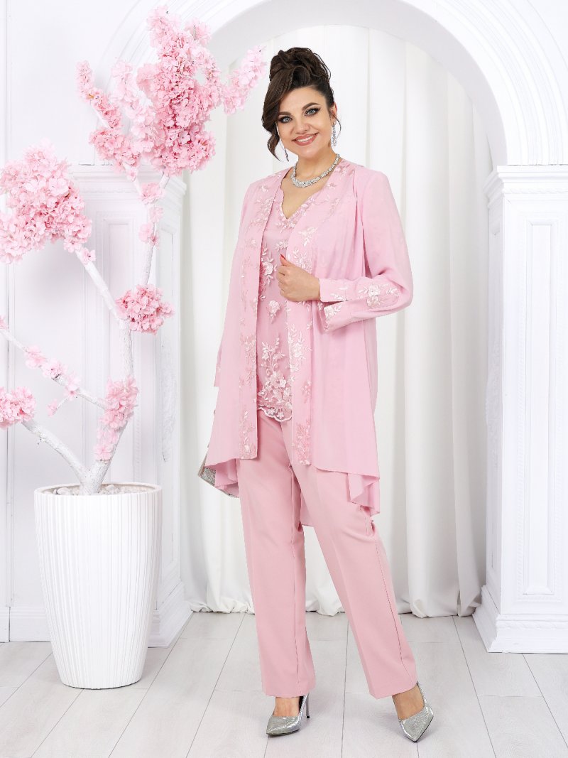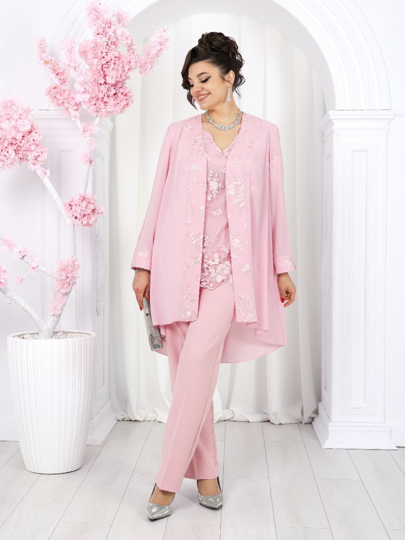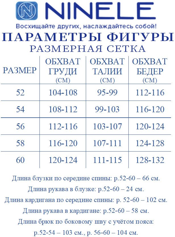 6066 Комплект брючный Представляем роскошную вечернюю тройку — идеальный ансамбль для особых случаев! Костюм сочетает воздушный кардиган, соблазнительную блузку и безупречные брюки, создавая образ абсолютной женственности и утончённого шика. Сияние гипюра и струящийся шифон создают образ для особых случаев. Лёгкие дышащие ткани позволяют выглядеть безупречно весь вечер. Комплект брючный 3-х предметный, состоящий из кардигана, блузки и брюк. Кардиган силуэта «трапеция», выполнен из плательного шифона. Модель без подкладки, без застежки, воротника и плечевых накладок. Низ изделия асимметричный -- спинка относительно переда удлинена к центру. Борта и горловина спинки обработаны фигурной планкой. Рукав втачной, длиной ¾; по низу рукава разрез, оформленный закругленными планками в виде «арки»; низ разреза и концы манжеты зафиксированы закрепкой. Верхний слой манжеты, планки борта и разреза рукава выполнен из гипюра. Длина кардигана (по спинке) – 102 см; длина рукава (с манжетой) – 58 см. Блузка полуприлегающего силуэта. Модель без подкладки, без застежки и воротника, с плечевыми накладками. На спинке обработаны талиевые вытачки, горловина окантована узкой косой бейкой. Перед двухслойный: нижний слой из плательного шифона, верхний -- из гипюра с фестонами по низу; на обоих слоях обработаны нагрудные вытачки, направленные от пройм. Горловина переда с V-образным вырезом, край имеет форму «волны». Рукав втачной, короткий, выполнен из гипюра и по низу оформлен фестонами. Длина блузки – 66 см; длина рукава – 24 см. Брюки классические, длинные, с посадкой на талии, выполнены из костюмно- плательной ткани. Модель со стрелками. Передние и задние половинки брюк с талиевыми вытачками, направленными от пояса вниз. Спереди обработаны наклонные боковые карманы и центральная застёжка на тесьму-«молнию». Притачной пояс застегивается на 1 петлю и 1 пуговицу; для лучшего прилегания по линии талии в притачном поясе предусмотрена эластичная лента, вставленная по спинке. Длина брюк по боковому (с поясом) – 103 см (52-54 р-р), 104 см (56-60 р-р).