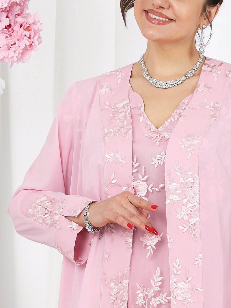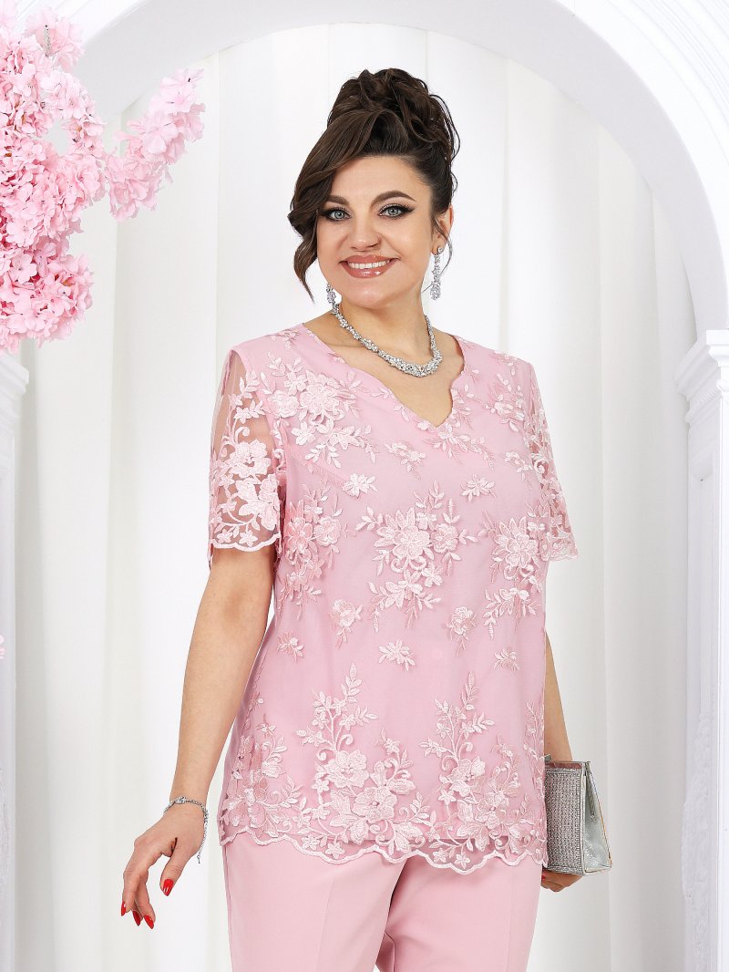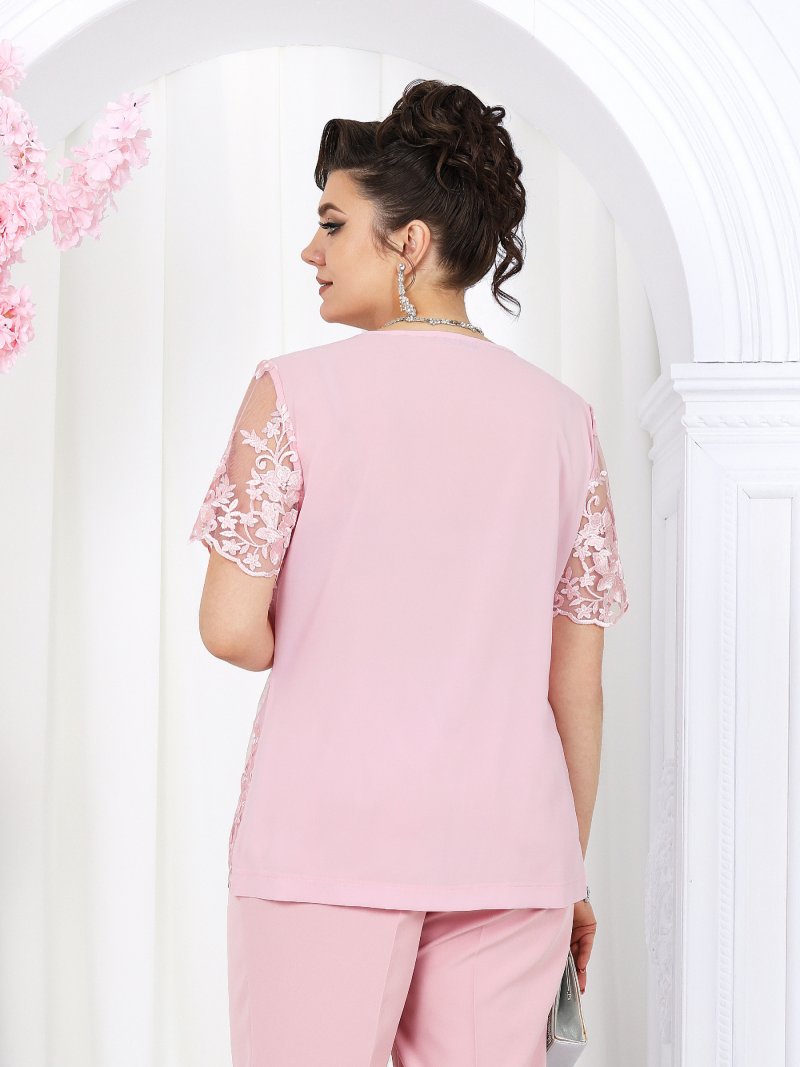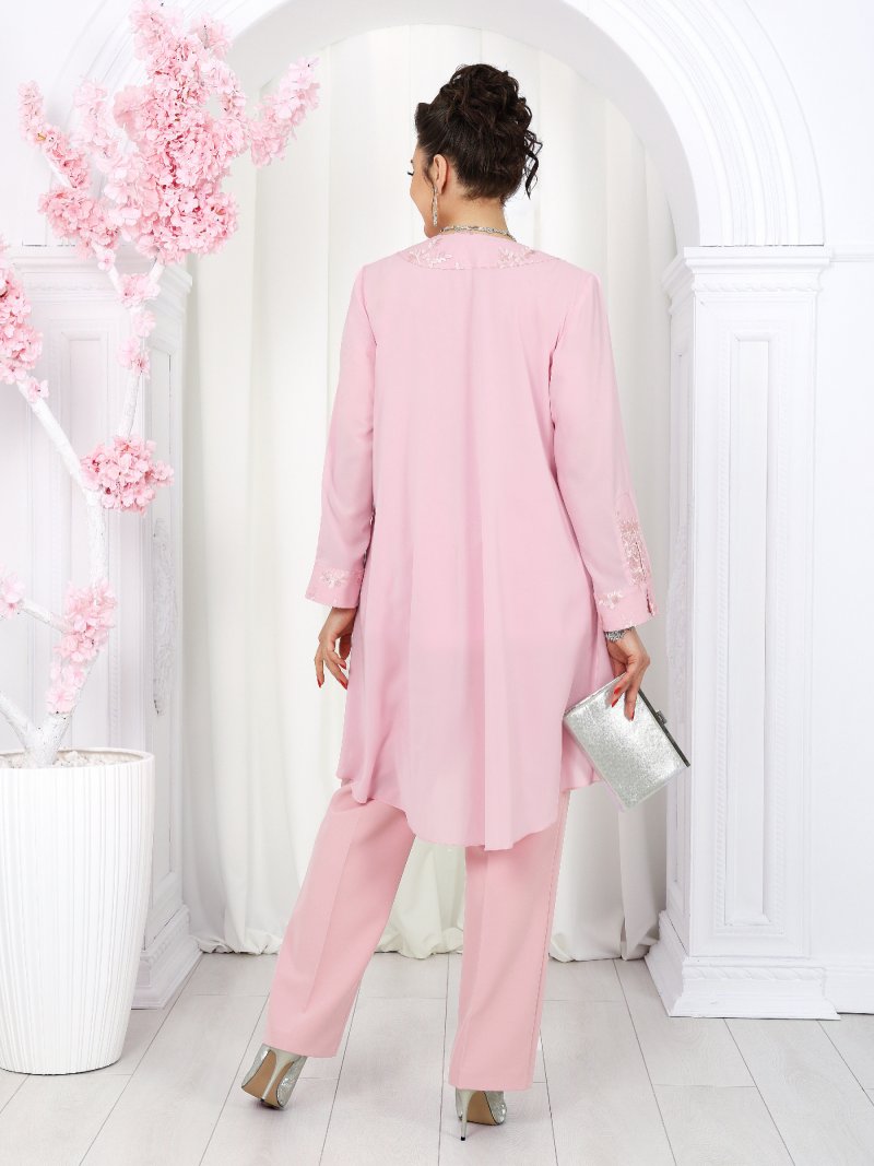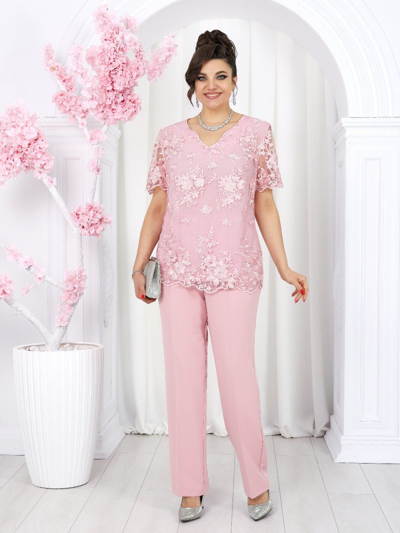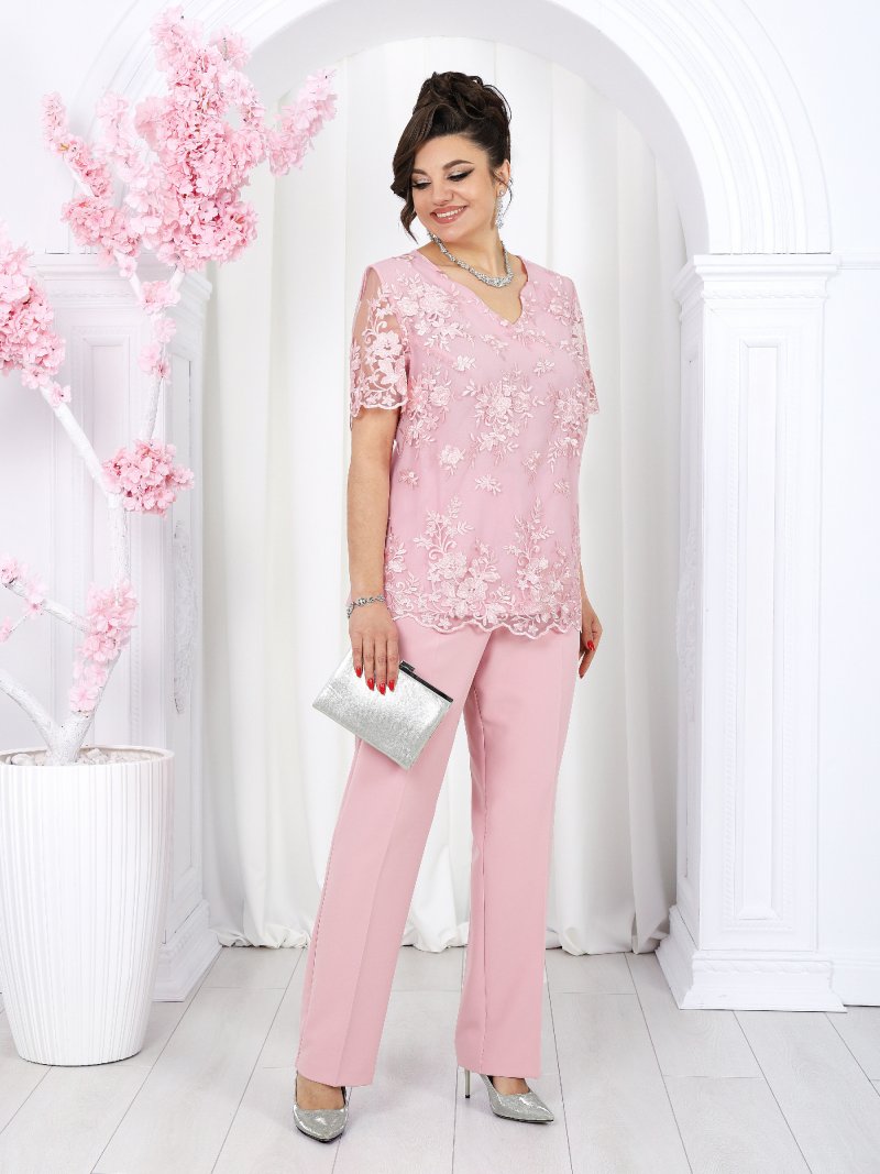 6066 Комплект брючный Представляем роскошную вечернюю тройку — идеальный ансамбль для особых случаев! Костюм сочетает воздушный кардиган, соблазнительную блузку и безупречные брюки, создавая образ абсолютной женственности и утончённого шика. Сияние гипюра и струящийся шифон создают образ для особых случаев. Лёгкие дышащие ткани позволяют выглядеть безупречно весь вечер. Комплект брючный 3-х предметный, состоящий из кардигана, блузки и брюк. Кардиган силуэта «трапеция», выполнен из плательного шифона. Модель без подкладки, без застежки, воротника и плечевых накладок. Низ изделия асимметричный -- спинка относительно переда удлинена к центру. Борта и горловина спинки обработаны фигурной планкой. Рукав втачной, длиной ¾; по низу рукава разрез, оформленный закругленными планками в виде «арки»; низ разреза и концы манжеты зафиксированы закрепкой. Верхний слой манжеты, планки борта и разреза рукава выполнен из гипюра. Длина кардигана (по спинке) – 102 см; длина рукава (с манжетой) – 58 см. Блузка полуприлегающего силуэта. Модель без подкладки, без застежки и воротника, с плечевыми накладками. На спинке обработаны талиевые вытачки, горловина окантована узкой косой бейкой. Перед двухслойный: нижний слой из плательного шифона, верхний -- из гипюра с фестонами по низу; на обоих слоях обработаны нагрудные вытачки, направленные от пройм. Горловина переда с V-образным вырезом, край имеет форму «волны». Рукав втачной, короткий, выполнен из гипюра и по низу оформлен фестонами. Длина блузки – 66 см; длина рукава – 24 см. Брюки классические, длинные, с посадкой на талии, выполнены из костюмно- плательной ткани. Модель со стрелками. Передние и задние половинки брюк с талиевыми вытачками, направленными от пояса вниз. Спереди обработаны наклонные боковые карманы и центральная застёжка на тесьму-«молнию». Притачной пояс застегивается на 1 петлю и 1 пуговицу; для лучшего прилегания по линии талии в притачном поясе предусмотрена эластичная лента, вставленная по спинке. Длина брюк по боковому (с поясом) – 103 см (52-54 р-р), 104 см (56-60 р-р).