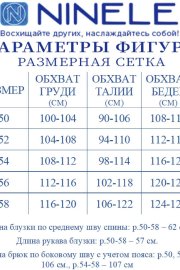 Блузка полуприлегающего силуэта, выполнена из трикотажного полотна с фактурной лицевой стороной «люрекс». Модель без подкладки, с плечевыми накладками. Спинка с талиевыми вытачками и средним швом. По линии талии в левой части переда – горизонтальный подрез с односторонними складками и отлетной деталью в шве. По линии талии в правой части переда обработан цельнокроеный пояс, край которого крепится в левом боковом шве. Горловина округлая, углубленная спереди. Рукав длинный, втачной. Длина блузки – 62 см (50-58 р-р), 64 см (60-64 р-р); длина рукава – 57 см (50-58 р-р), 58 см (60-64 р-р).
