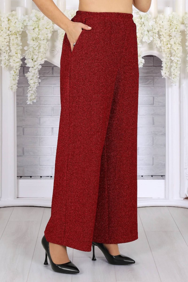 Брюки длинные, с посадкой на талии, выполнены из трикотажного полотна с фактурной лицевой стороной «люрекс». Модель без стрелок, без застежки. Спереди обработаны наклонные боковые карманы. Для лучшего прилегания по линии талии в притачном поясе предусмотрена эластичная лента, вставленная по всей длине. Длина брюк по боковому (с поясом) – 106 см (50-52 р-р), 107 см (54-58 р-р), 108 см (60-64 р-р).