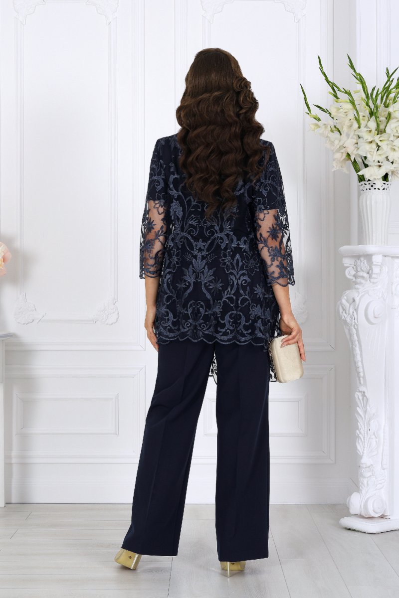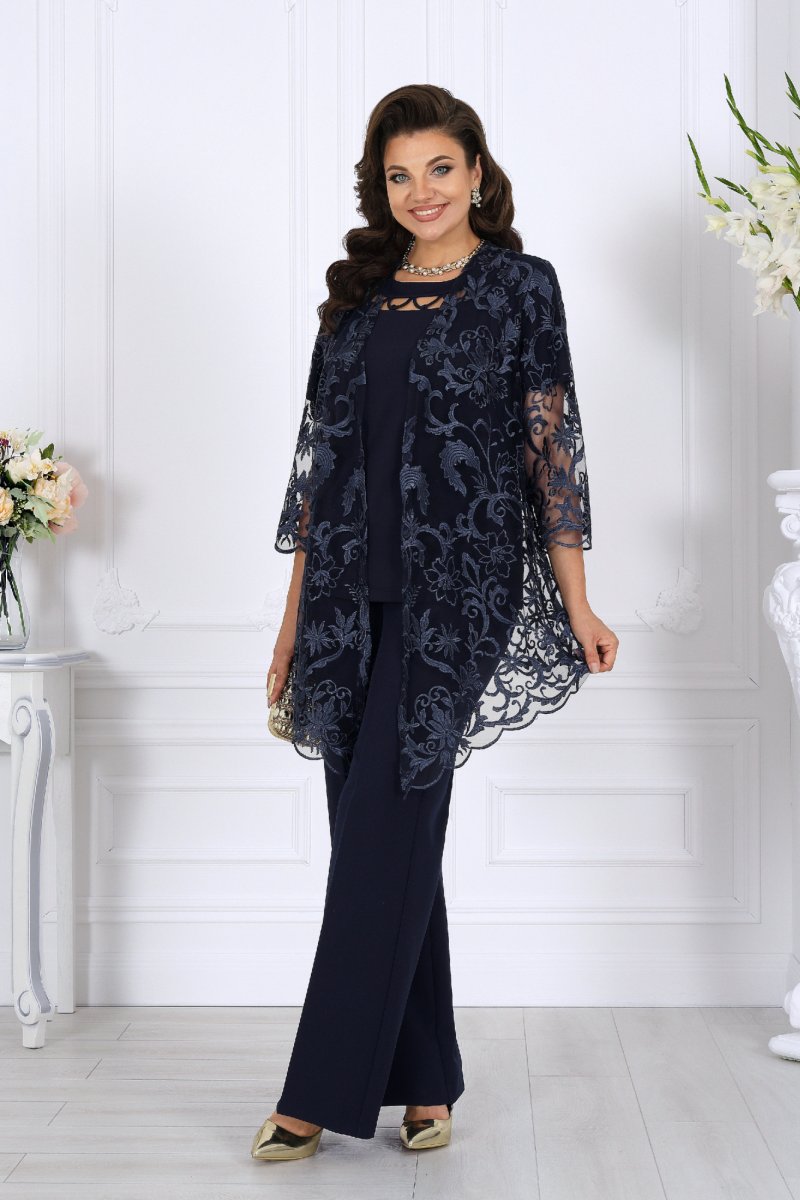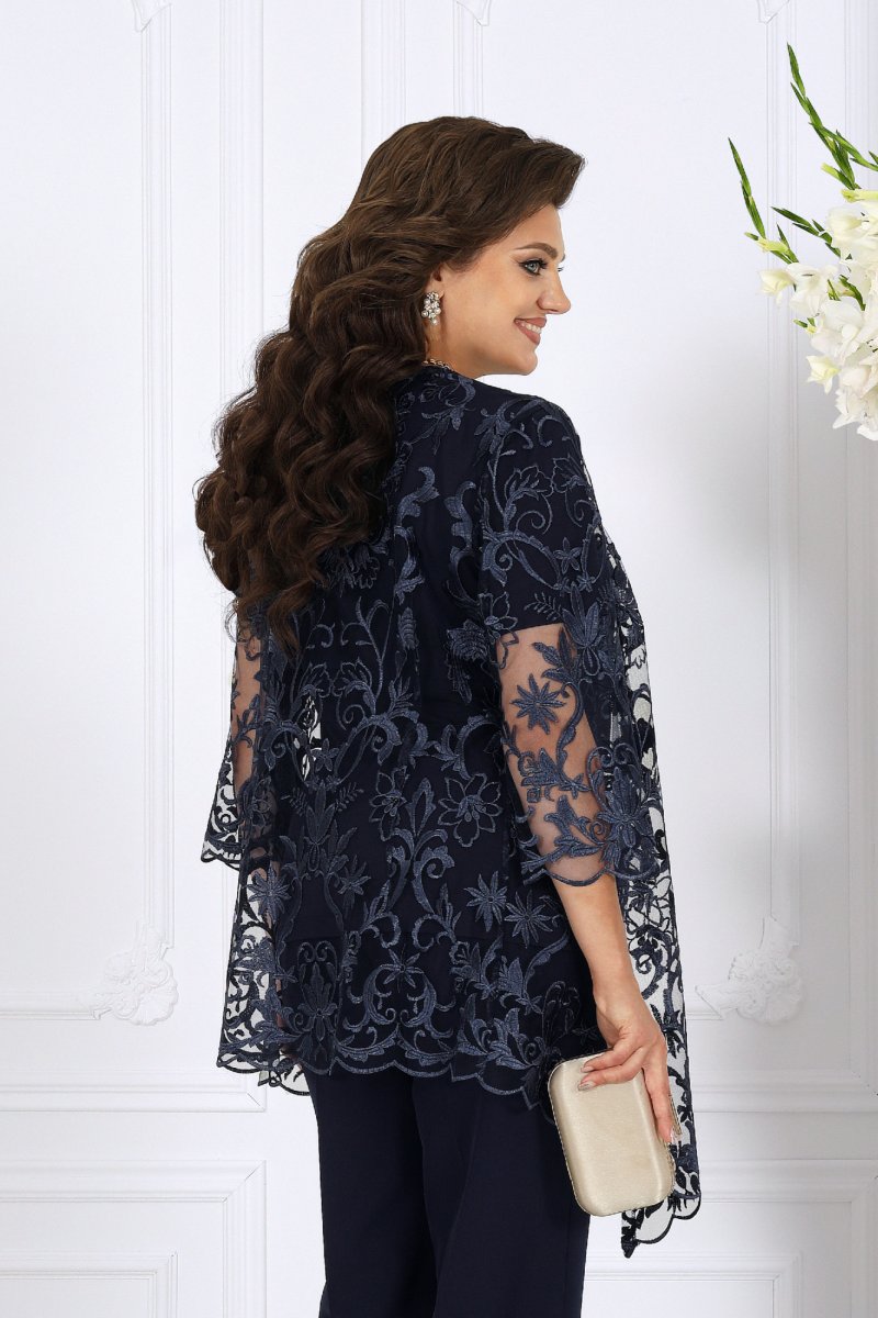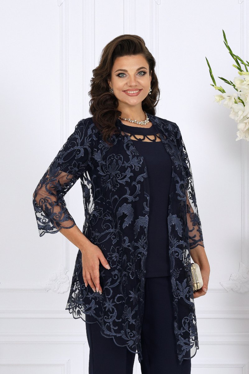 Комплект состоит из трёх предметов: изысканного кардигана из гипюра, мягкой трикотажной блузки и классических брюк со стрелками. Такой ансамбль выглядит нарядно, подчеркивает женственность и формирует правильный силуэт даже для фигур plus size.
