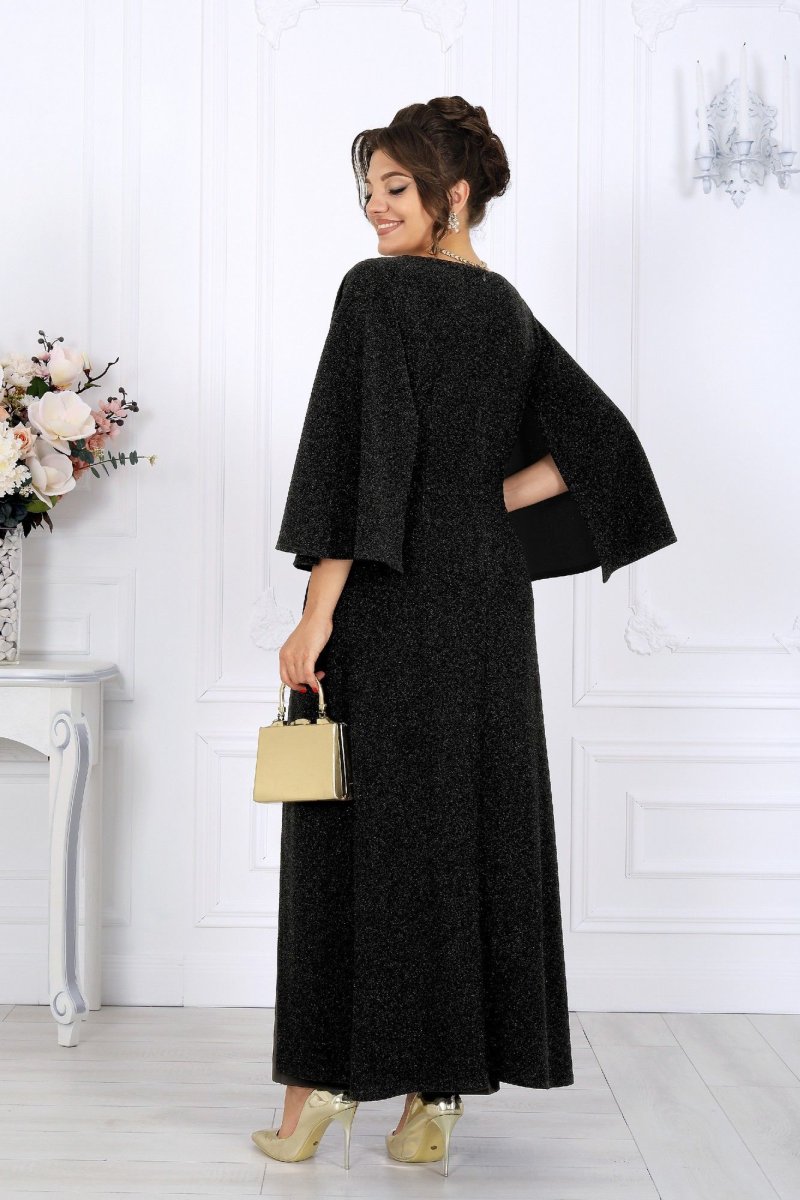 Туника полуприлегающего силуэта с расширением к низу, выполнена из трикотажного полотна с фактурной лицевой стороной «люрекс». Модель отрезная по линии талии; верхняя часть переда и спинки (лиф) на трикотажной подкладке. Лиф переда с одним рельефным швом, направленным от левой проймы; нижняя часть переда состоит из двух деталей, скрепленных на запах. По линии талии, вдоль рельефа, перед задрапирован сборкой и односторонними складками. На спинке обработаны талиевые вытачки и средний шов с застежкой на потайную тесьму-«молнию» (50 см). Вырез горловины спинки и переда формы «лодочка». Рукав без шва, с отлетными краями; крепится к пройме только в верхней части. Длина туники – 139 см; длина рукава – 51 см.