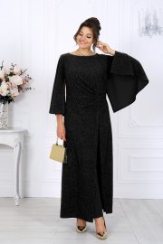 Туника свободно струится по фигуре, легко скрывая всё лишнее и подчеркивая достоинства. Драпировка по линии талии формирует красивый силуэт «песочных часов», а асимметричный запах добавляет образу динамики и утончённости. Эффектные рукава придают наряду торжественность, сохраняя при этом абсолютную лёгкость движений. Каждая деталь продумана до мелочей — от мягкой подкладки, обеспечивающей комфорт, до аккуратной потайной застёжки, сохраняющей чистоту линий.