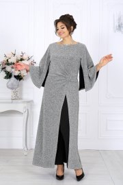 Туника свободно струится по фигуре, легко скрывая всё лишнее и подчеркивая достоинства. Драпировка по линии талии формирует красивый силуэт «песочных часов», а асимметричный запах добавляет образу динамики и утончённости. Эффектные рукава придают наряду торжественность, сохраняя при этом абсолютную лёгкость движений. Каждая деталь продумана до мелочей — от мягкой подкладки, обеспечивающей комфорт, до аккуратной потайной застёжки, сохраняющей чистоту линий.