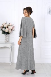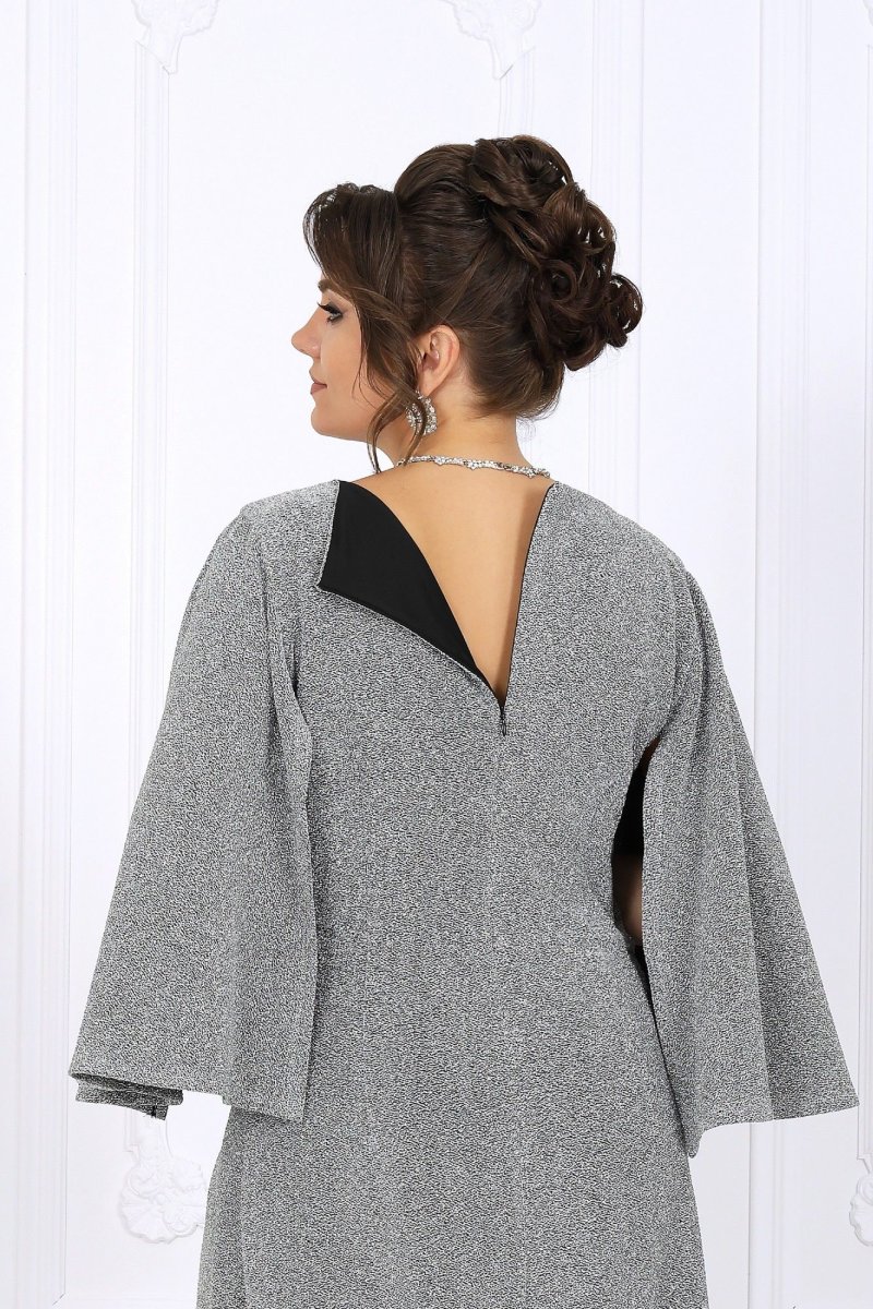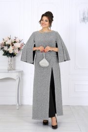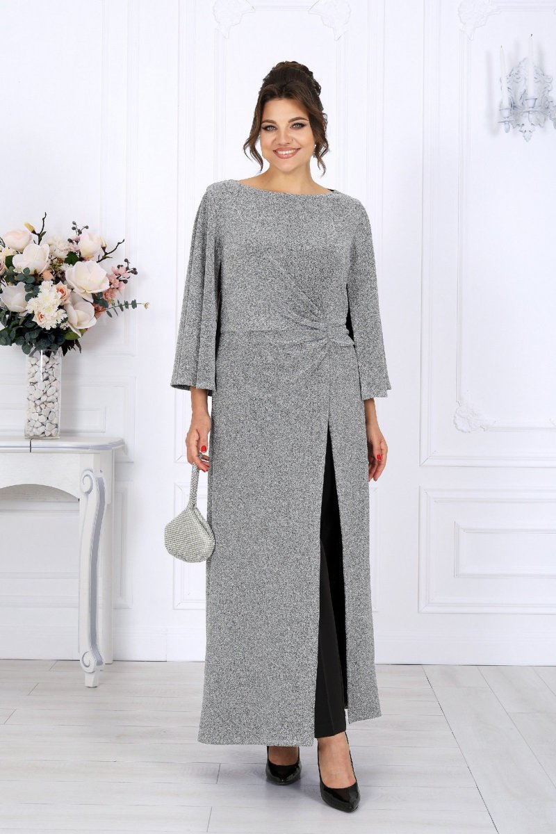 Туника полуприлегающего силуэта с расширением к низу, выполнена из трикотажного полотна с фактурной лицевой стороной «люрекс». Модель отрезная по линии талии; верхняя часть переда и спинки (лиф) на трикотажной подкладке. Лиф переда с одним рельефным швом, направленным от левой проймы; нижняя часть переда состоит из двух деталей, скрепленных на запах. По линии талии, вдоль рельефа, перед задрапирован сборкой и односторонними складками. На спинке обработаны талиевые вытачки и средний шов с застежкой на потайную тесьму-«молнию» (50 см). Вырез горловины спинки и переда формы «лодочка». Рукав без шва, с отлетными краями; крепится к пройме только в верхней части. Длина туники – 139 см; длина рукава – 51 см.
