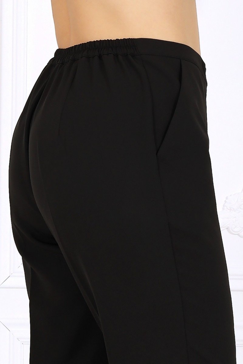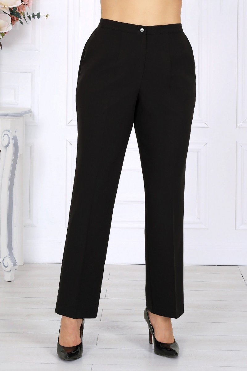 Брюки классические, длинные, с посадкой на талии, выполнены из костюмно- плательной ткани. Модель со стрелками. Передние и задние половинки брюк с талиевыми вытачками, направленными от пояса вниз. Спереди обработаны наклонные боковые карманы и центральная застёжка на тесьму-«молнию». Притачной пояс застегивается на 1 петлю и 1 пуговицу; для лучшего прилегания по линии талии в притачном поясе предусмотрена эластичная лента, вставленная по спинке. Длина брюк (с поясом) – 102 см (50-52р-р); длина брюк (с поясом) – 103 см (54-58р-р).