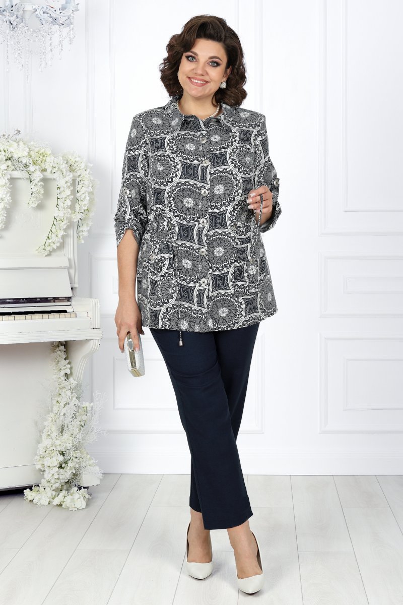 Блузка прямого силуэта, с центральной бортовой застежкой с отрезными планками на 7 петель и 7 пуговиц, со стояче-отложным воротником с отрезной стойкой. Длина изделия по середине спинки 72 см от шва втачивания воротника в горловину. Перед с нагрудными вытачками, выходящими из пройм. В нижней части переда настрочены накладные карманы, с имитацией бантовой складки посередине кармана и клапаны, застегивающиеся на 1 петлю и 1 пуговицу. По спинке и частично по переду настрочена кулиса, в которую втянут шнур. Для регулировки сборки по кулисе на шнур продеты фиксаторы, концы шнура оформлены наконечниками. Рукава втачные, одношовные, с притачными манжетами, застегивающимися на 1 петлю и 1 пуговицу, с разрезами в нижних швах рукавов, с настрочными патами, застегивающимися на 1 петлю и 1 пуговицу. Длина рукава с манжетой 59,5 см. Длина рукава может регулироваться с помощью паты. Блузка с плечевыми накладками.
