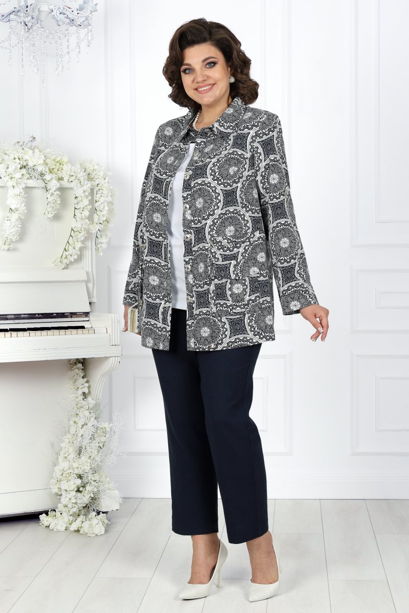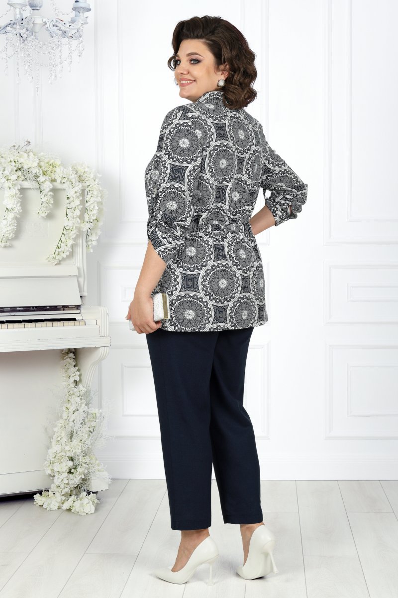 Комплект брючный 3-х предметный, состоящий из блузки, выполненной из отделочной ткани лен принт, брюк, выполненных из однотонного льна и джемпера из трикотажного полотна.