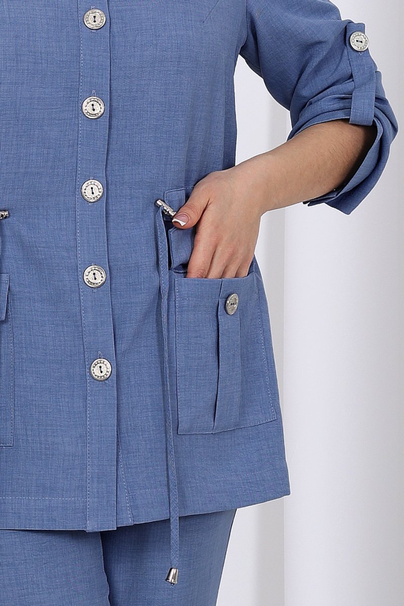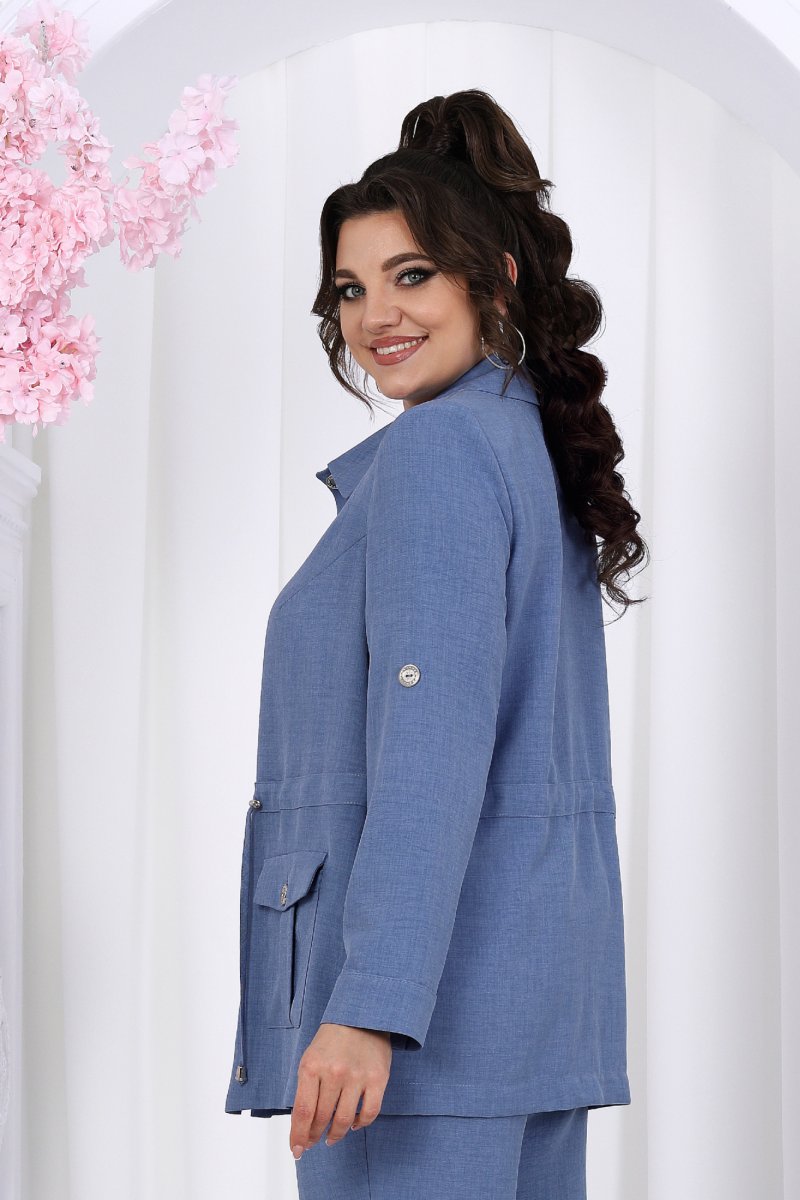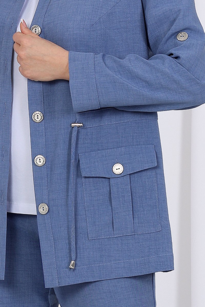 Жакет прямого силуэта, выполнен из ткани «лен-вишер». Модель без подкладки, с плечевыми накладками и однобортной внешней застежкой с отрезными планками на 7 петель и 7 пуговиц. Перед с нагрудными вытачками, выходящими из пройм. В нижней части переда настрочены накладные карманы с бантовой складкой посередине кармана и клапаны, застегивающиеся на 1 петлю и 1 пуговицу. По спинке и частично по переду настрочена кулиса, в которую втянут поясок из основной ткани. Для регулировки сборки по кулисе предусмотрены фиксаторы, концы пояса оформлены наконечниками. Горловина округлой формы со стояче-отложным воротником на отрезной стойке. Рукав втачной, длинный, с притачной манжетой, застегивающейся на 1 петлю и 1 пуговицу; по середине рукава настрочена пата, застегивающаяся на 1 петлю и 1 пуговицу, что позволяет регулировать длину рукава. Длина жакета - 71 см (46-50 р-р), 72 см (52-60 р-р), 73 см (62-66 р-р). Длина рукава (с манжетой) - 61 см.
