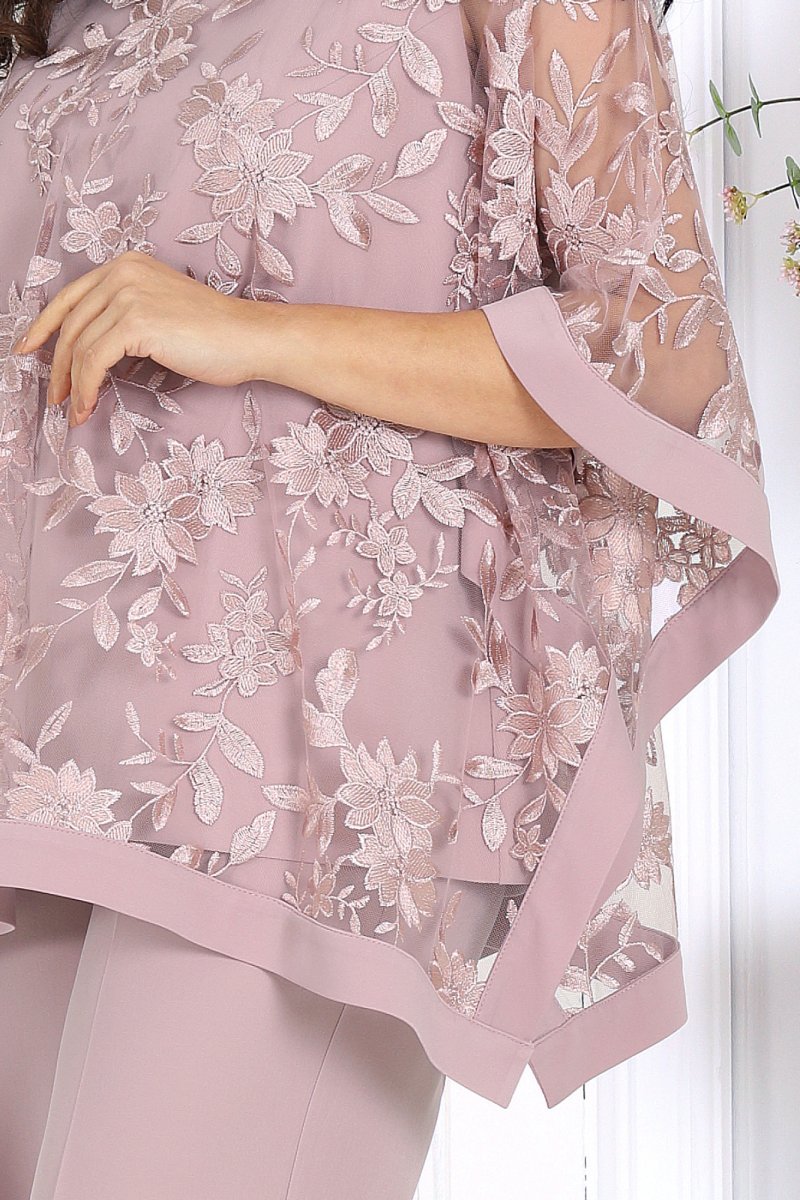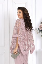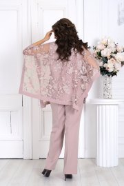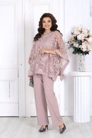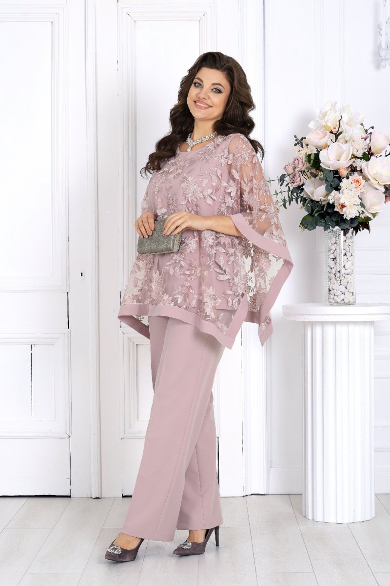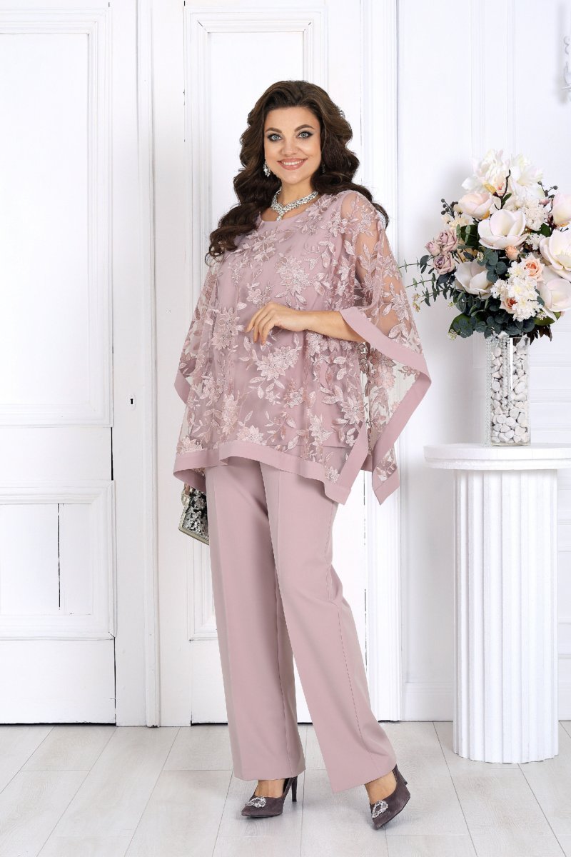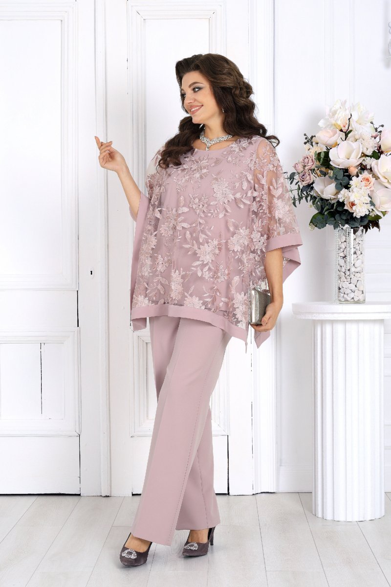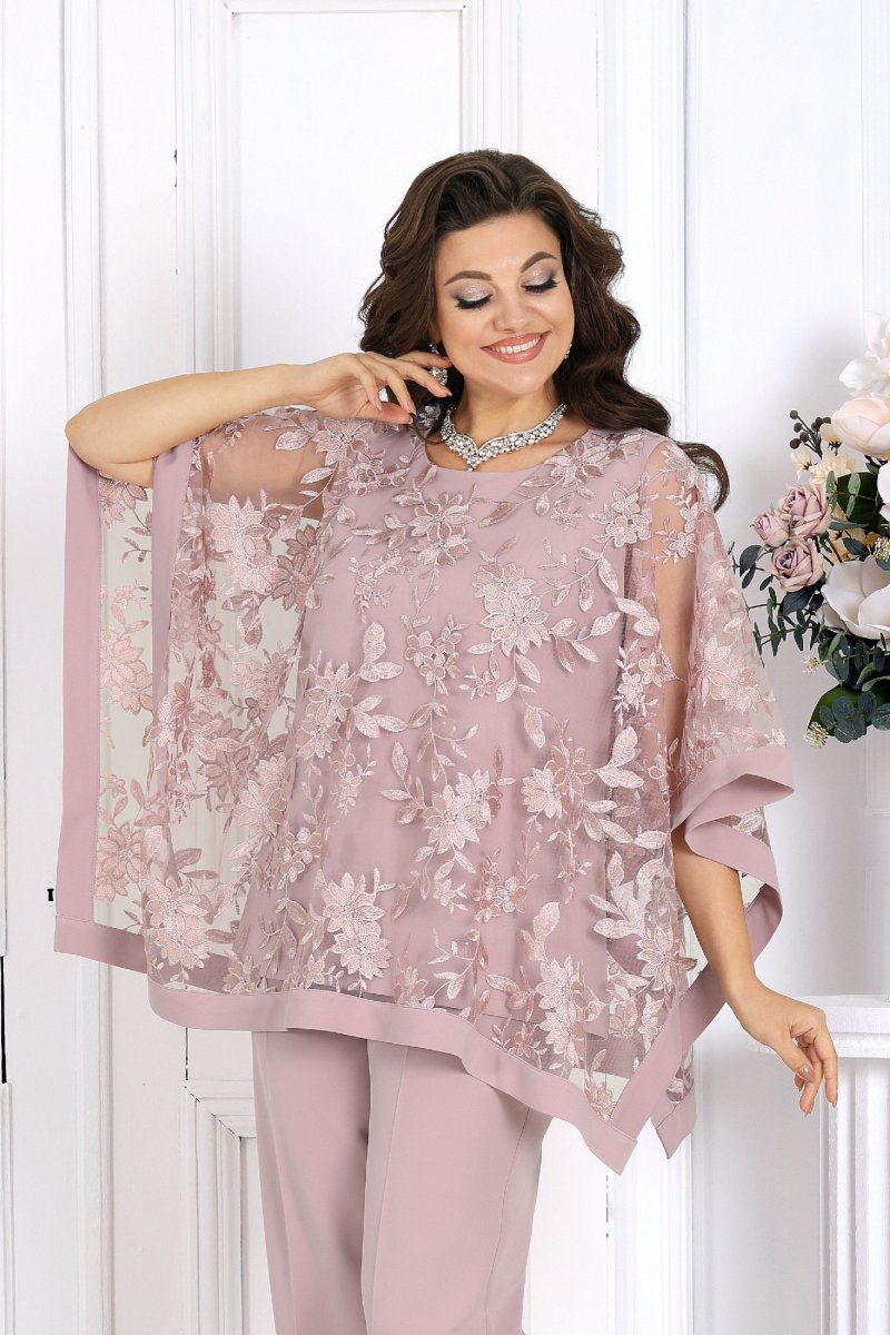 Свободный крой и продуманная посадка делают костюм комфортным для женщин с формами — он не сковывает движения и красиво драпируется, визуально вытягивая силуэт. Верх выполнен в виде эффектной блузки из гипюра, которая мягко скрывает зону рук и талии, а классические брюки со стрелками придают образу стройность и изящество.