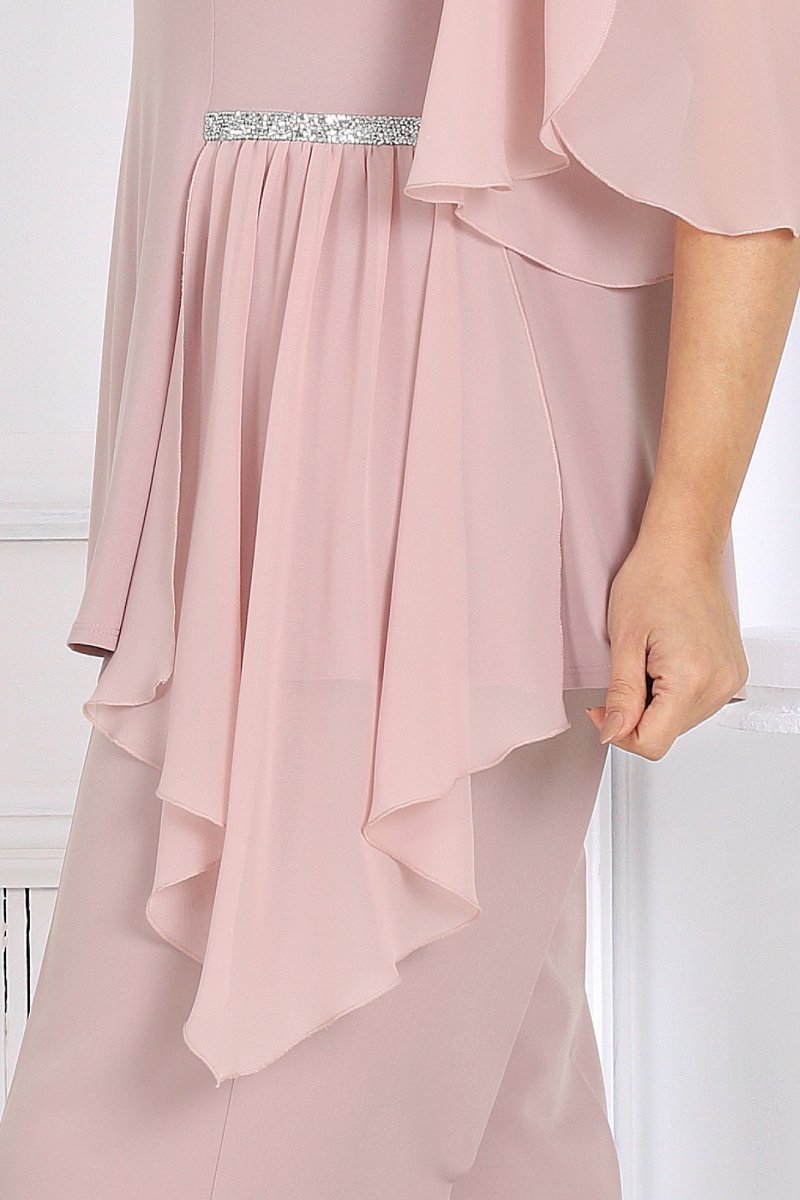 Блузка полуприлегающего силуэта, выполнена из трикотажного полотна «масло». Модель без воротника и застежки. На переде и спинке обработаны рельефные швы, направленные от проймы до низа. На левой боковой части переда – горизонтальный подрез с отлетной деталью из шифона. Шов подреза декорирован тесьмой со стразами. Горловина круглой формы, окантована косой бейкой из основного полотна; спереди декорирована стразами и дополнена вырезом «капля». Рукав короткий, формы «крылышко на запах», со скругленными срезами; выполнен из шифона. Длина блузки – 57 см; длина рукава – 41 см.