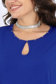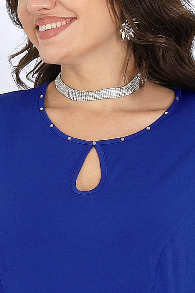 Блузка полуприлегающего силуэта, выполнена из трикотажного полотна «масло». Модель без воротника и застежки. На переде и спинке обработаны рельефные швы, направленные от проймы до низа. На левой боковой части переда – горизонтальный подрез с отлетной деталью из шифона. Шов подреза декорирован тесьмой со стразами. Горловина круглой формы, окантована косой бейкой из основного полотна; спереди декорирована стразами и дополнена вырезом «капля». Рукав короткий, формы «крылышко на запах», со скругленными срезами; выполнен из шифона. Длина блузки – 57 см; длина рукава – 41 см.
