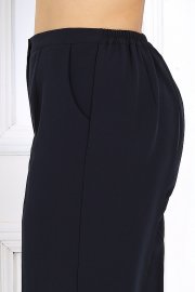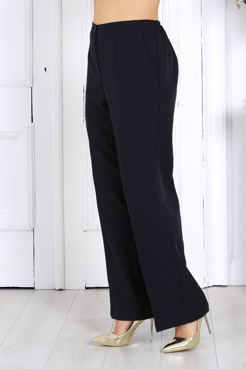 Брюки классические, длинные, с посадкой на талии, выполнены из костюмно- плательной ткани. Модель со стрелками. Передние и задние половинки брюк с талиевыми вытачками, направленными от пояса вниз. Спереди обработаны наклонные боковые карманы и центральная застёжка на тесьму-«молнию». Притачной пояс застегивается на 1 петлю и 1 пуговицу; для лучшего прилегания по линии талии в притачном поясе предусмотрена эластичная лента, вставленная по спинке. Длина брюк по боковому (с поясом) – 107 см.
