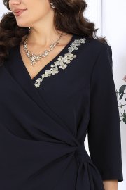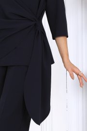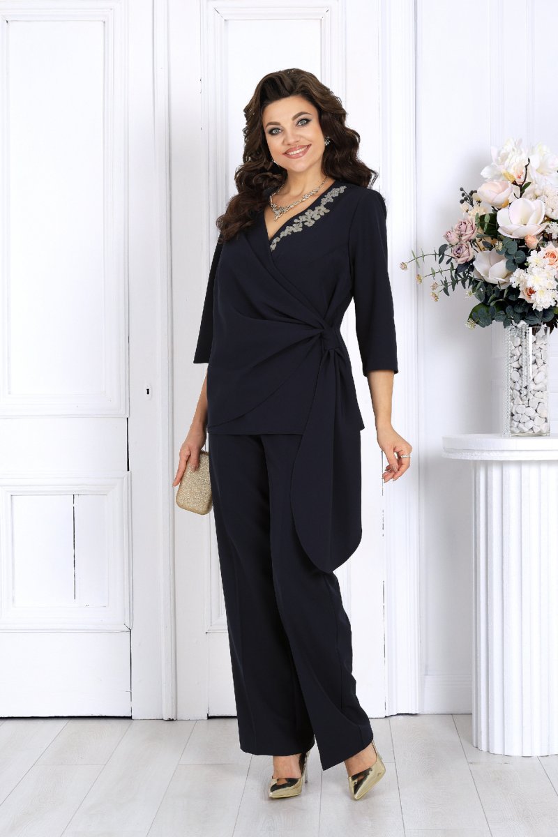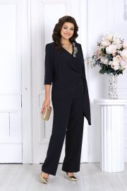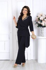 Брючный костюм — идеальный выбор для торжества. Элегантная вечерняя блузка на запах и брюки со стрелками создают утончённый силуэт и визуально стройнят. Модель выполнена из качественной костюмной ткани, украшена кружевом в области декольте.