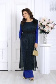 Блестящая туника с люрексом струится по силуэту, создавая эффект легкости и изысканности. В комплект входит пояс, акцентирующий талию, и декоративный цветок, добавляющий женственности и шарма.