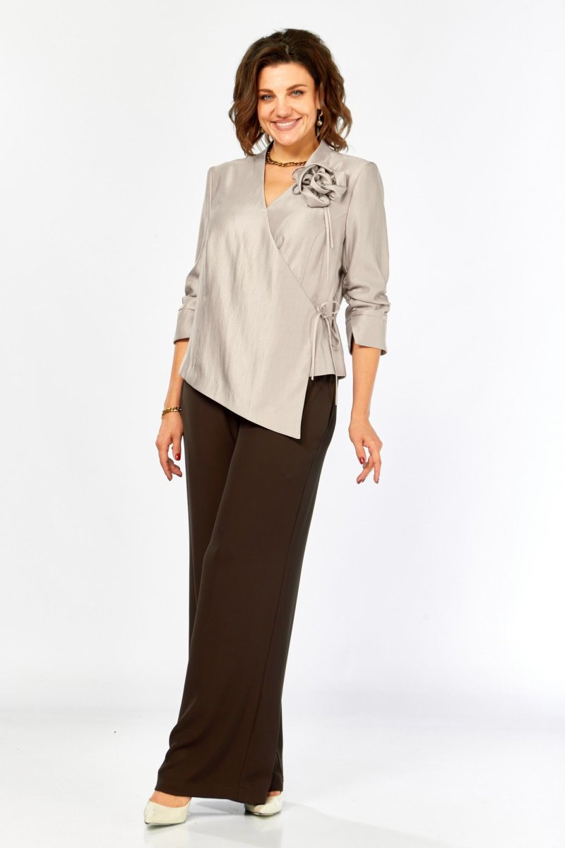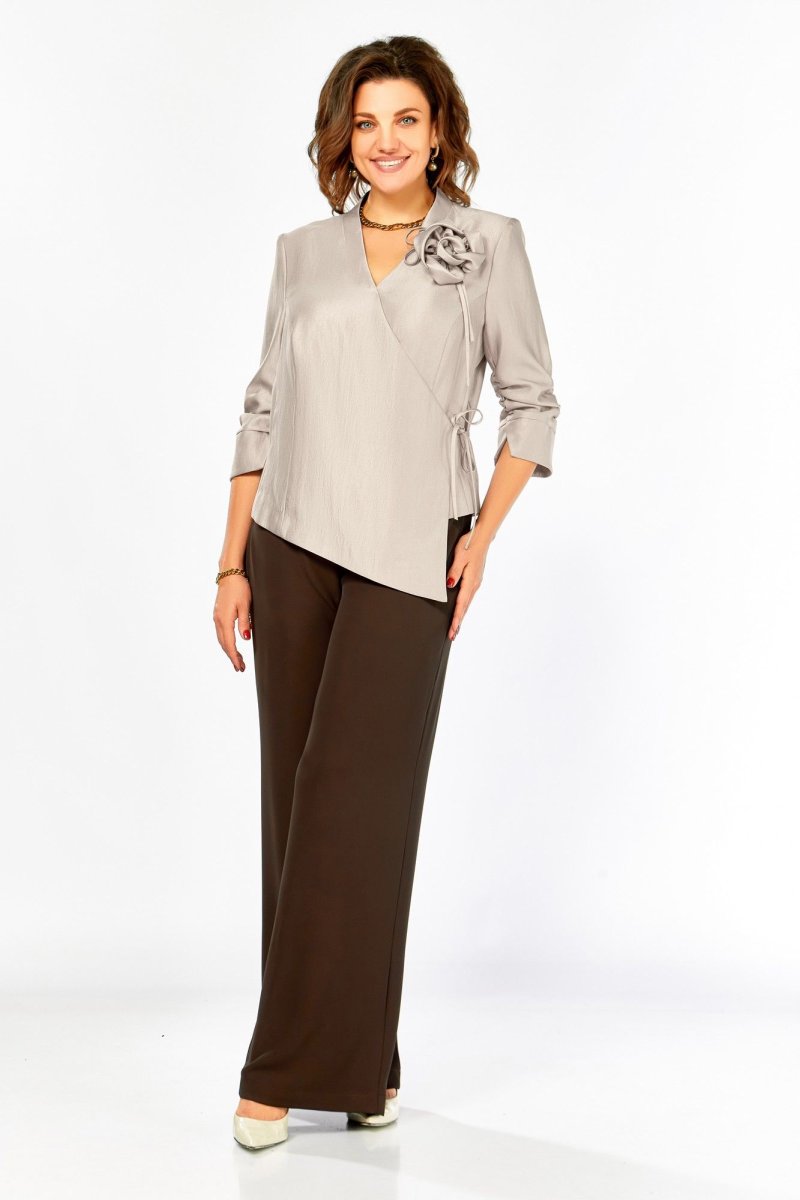 Нарядный комплект полуприлегающего силуэта. Блуза с запахом, V-образным вырезом горловины и цельнокроеной стойкой. Застежка-завязка. Спинка со средним швом и талиевыми вытачками. Рукав 3/4, присобран, по низу фигурная манжета. Брюки прямые на поясе. Пояс по спинке на резинке. Карманы в боковых швах.