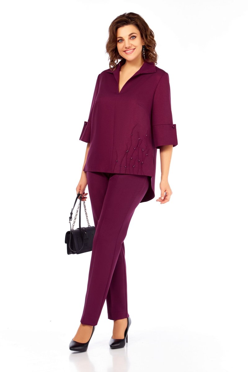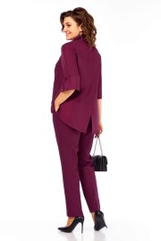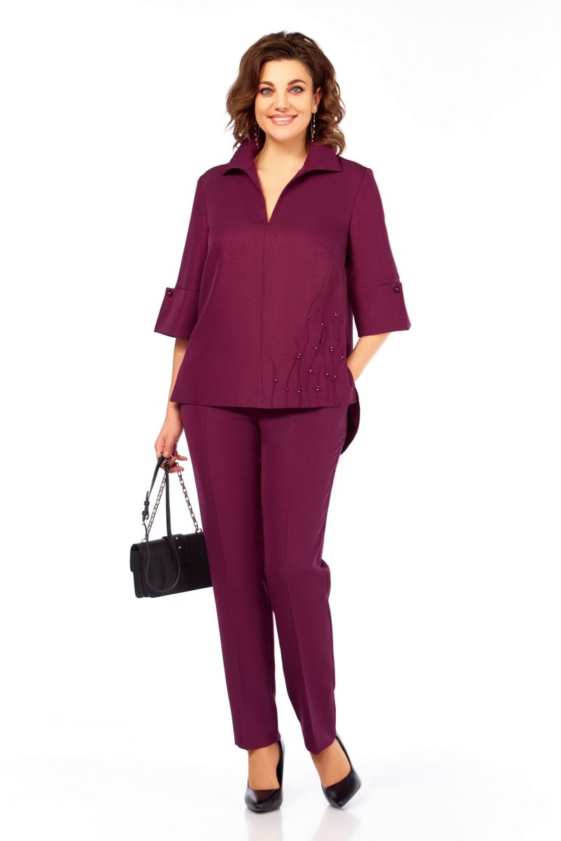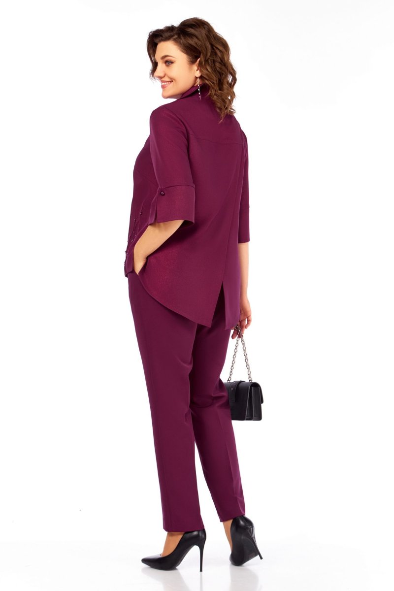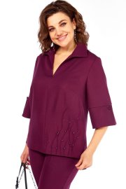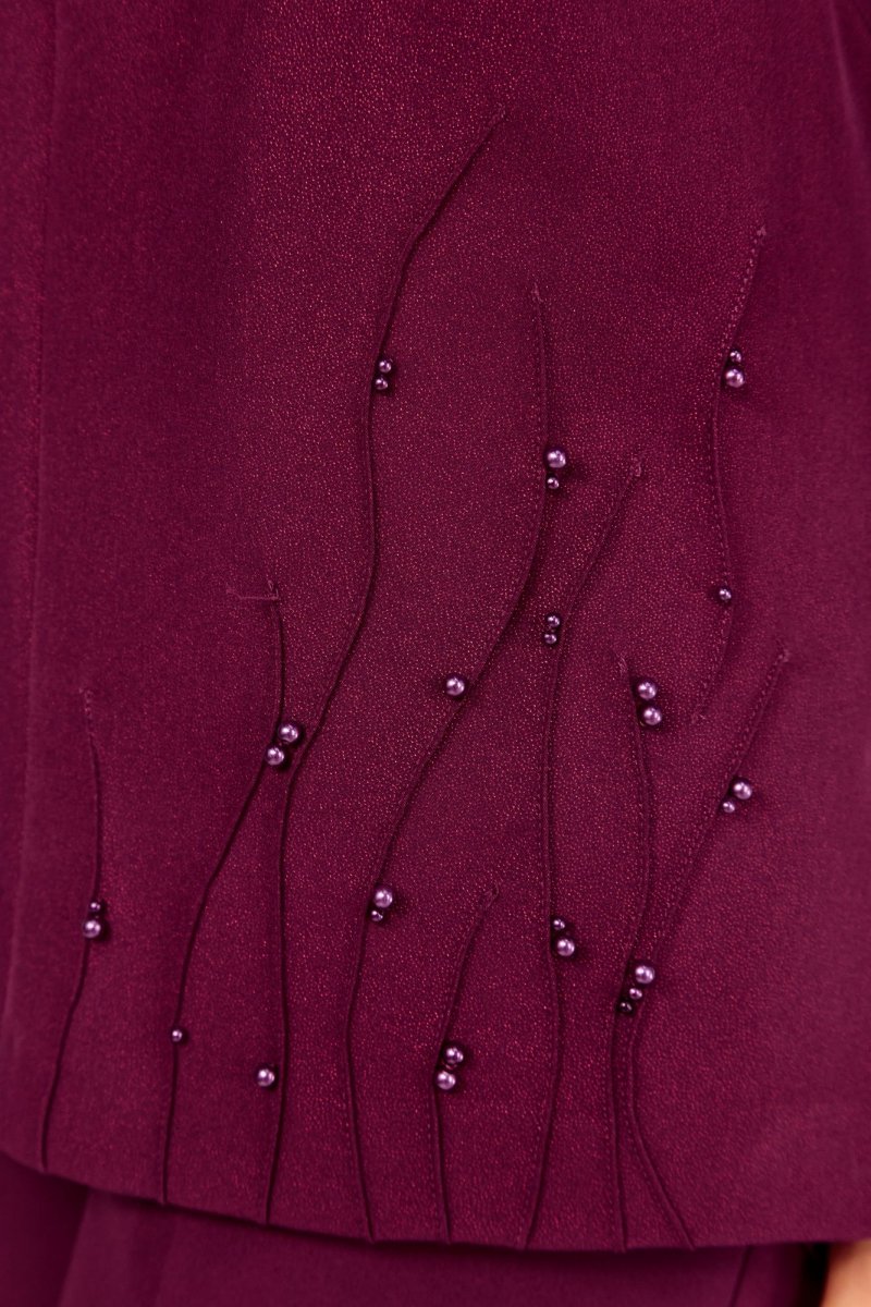 Комплект женский, состоит из блузы и брюк. Блузка из ткани с блеском. А брюки однотон. На блузе по центру шов, вырез горловины V-oбразной формы, с отложным воротником. По низу справа декоративный элемент в виде защипов и бусин пришивных. По спинке отрезная кокетка, от кокетки вниз детали на запах. Низ фигурной формы. Рукав ниже линии локтя, с притачной манжетой и отделочными пугавицами. Брюки слегка зауженные к низу со стрелками. Брюки на поясе, с застежкой на молнию, по спинке резинка. Длина блузы 75см, длина брюк 105см