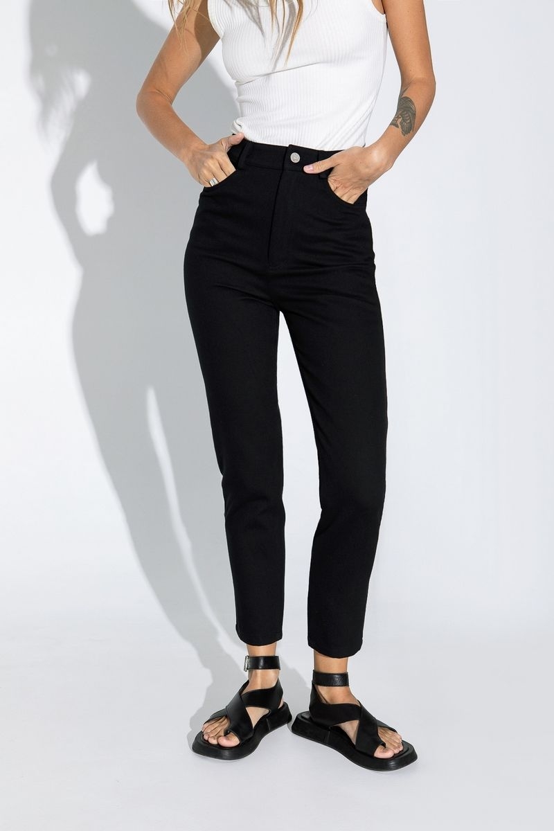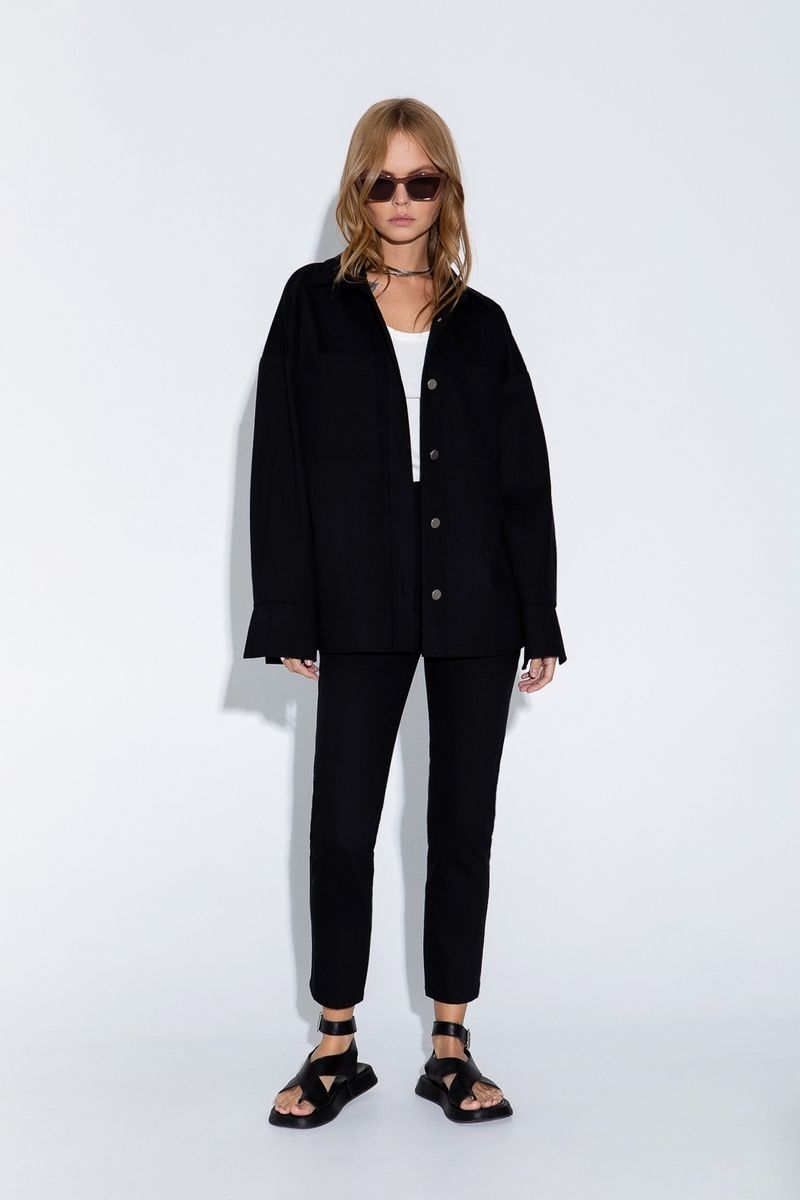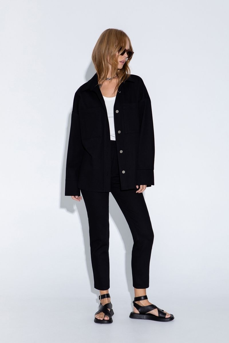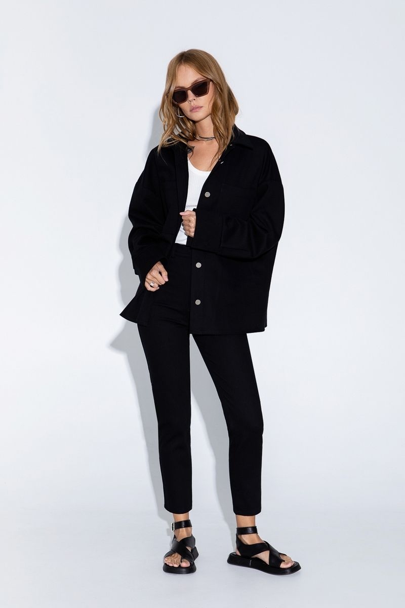 Джинсовый костюм из свободной рубашки и укороченных брюк с высокой посадкой Детали: рубашка прямого силуэта, спущенная линия плеча, накладные карманы, застежка на петли и металлические пуговицы, удлиненные рукава с притачными манжетами. Брюки прилегающего силуэта, притачной пояс со шлевками, застежка на молнию и пуговицу, перед с боковыми карманами, спинка с кокеткой и двумя накладными карманами Длина рубашки по спинке около 66 в размерах 40-46 и около 69 см в размерах 48-52 Длина рукава+ плечо около 51+11=62 см Длина брюк по боковому шву с поясом около 95 в размерах 40-46 и около 96,5 см в размерах 48-52, длина брюк по внутреннему шву около 65 см