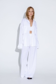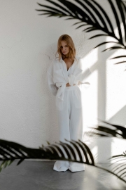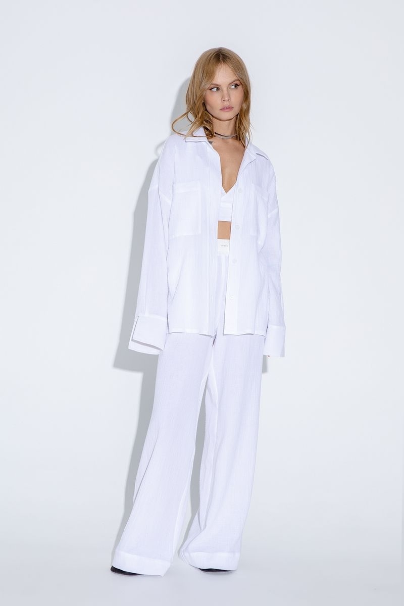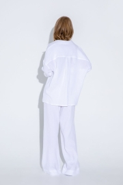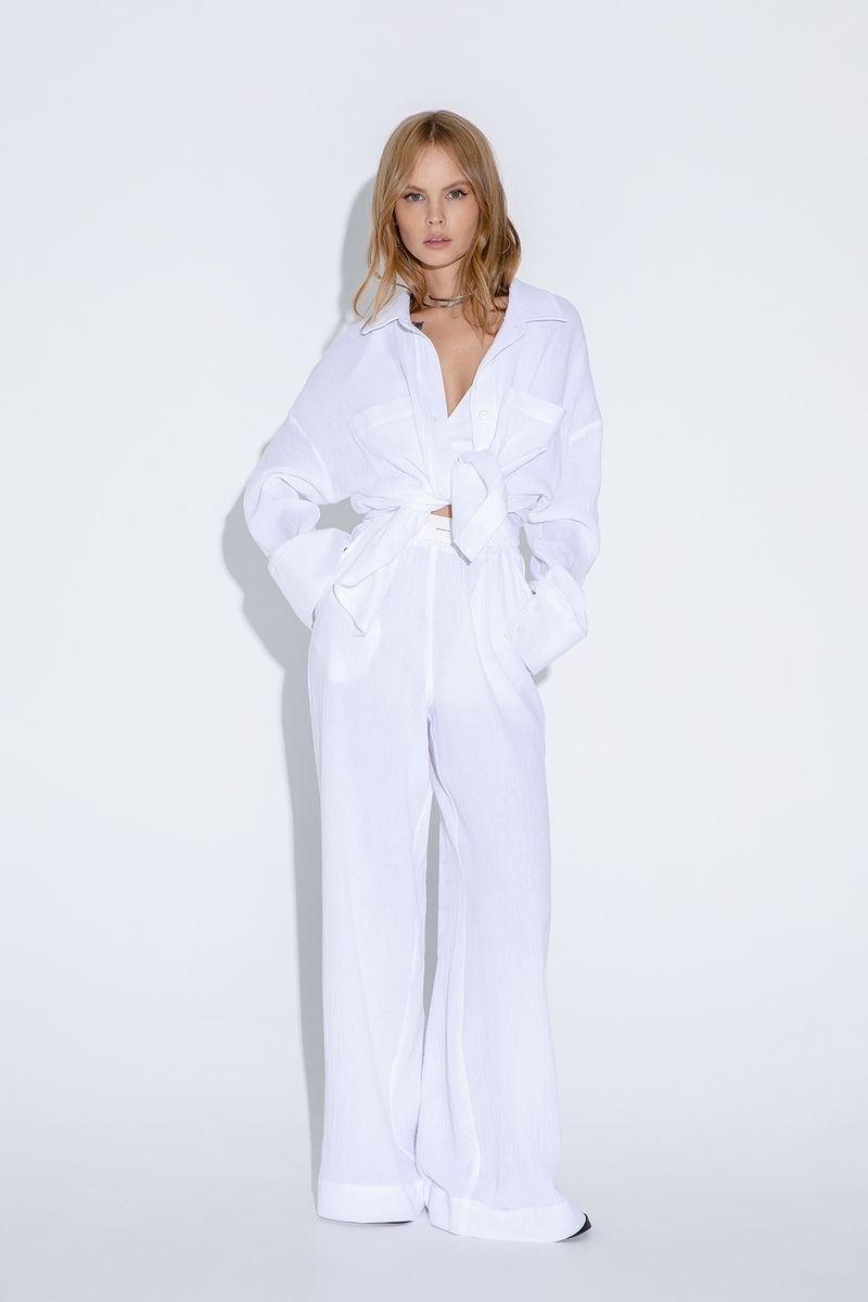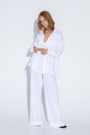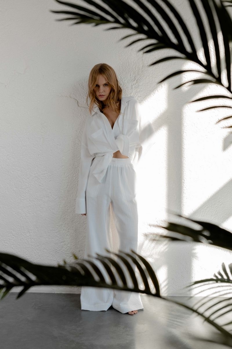Костюм- двойка из свободной рубашки и широких брюк из облегченного хлопка Детали: рубашка прямого силуэта, спущенная линия плеча, накладные карманы, застежка на петли и пуговицы, удлиненные рукава с притачными манжетами. Брюки прямого силуэта, притачной эластичный пояс, без застежки, перед с боковыми карманами Длина рубашки по спинке около 65 в размерах 40-46 и около 68 см в размерах 48-52 Длина рукава+ плечо около 51+11=62 см Длина брюк по боковому шву с поясом около 108 см в размерах 40-46 и около 109,5 см в размерах 48-52 Длина брюк по внутреннему шву около 80 см