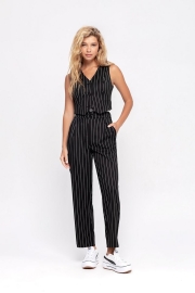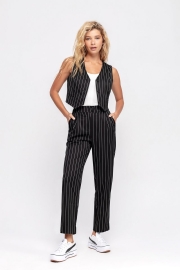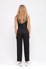 Текстильный костюм-двойка из укороченного жилета и брюк со складками Детали: жилет полуприлегающего силуэта с фигурным низом, застежка на петли и пуговицы, на подкладке из 100% вискозы. Брюки с высокой посадкой, притачной пояс со шлевками, задняя часть пояса эластичная- с резинкой, застежка на молнию и пуговицу, боковые карманы, передние половины с двумя складками Длина жилета по спинке около 38,5 см в размерах 40-46 и около 41,5 см в размерах 48-52; Длина брюк по боковому шву с поясом около 99 см в размерах 40-46 и около 100,5 см в размерах 48-52, длина по внутреннему шву около 69,5 см