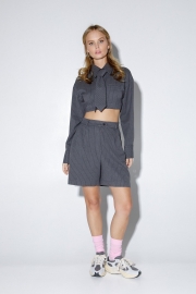 Костюм-двойка из укороченной рубашки со съемным галстуком и коротких свободных шорт из текстильной ткани в полоску. Детали: рубашка прямого силуэта, спущенная линия плеча, вытачки, застежка на петли и пуговицы, длинные рукава с притачными манжетами. Шорты с высокой посадкой, притачной пояс со шлевками, задняя часть пояса эластичная- с резинкой, застежка на молнию и пуговицу, боковые карманы, передние половины с двумя складками. Длина рубашки по спинке около 36 см в размерах 40-44 и около 38 см в размерах 46-48. Длина рукава+ плечо около 59+4= 63 см. Длина шорт по боковому шву с поясом около 48,5 см в размерах 40-46 и около 51,5 см в размерах 48-52