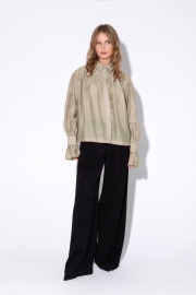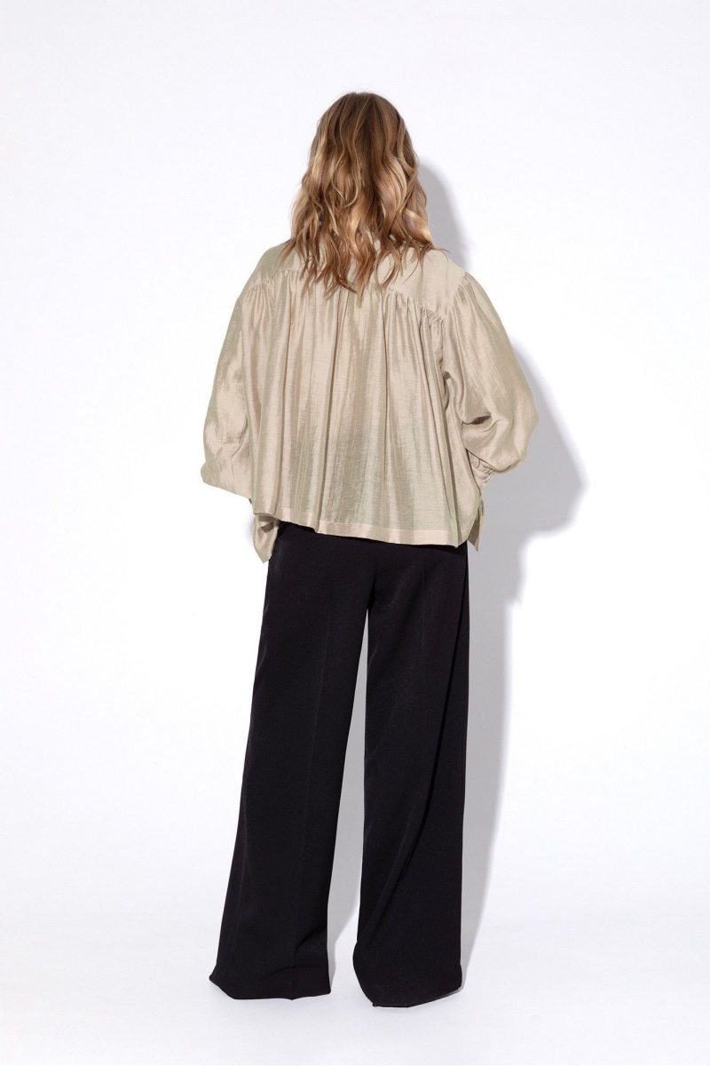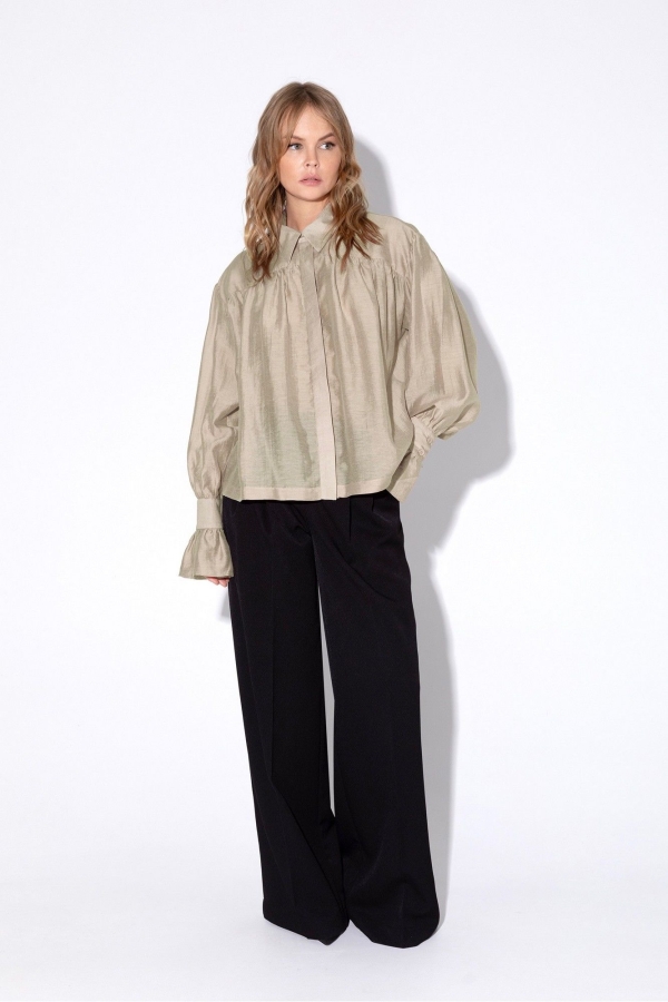 Комплект-двойка из свободной полупрозрачной блузы из вискозы и брюк-палаццо. Детали: блуза трапециевидного силуэта и свободного покроя, спущенная линия плеча, кокетки переда и спинки, рубашечный воротник, потайная застежка на петли и пуговицы, рукава втачные длинные с манжетой и оборкой, блуза без подкладки. Широкие брюки-палаццо с небольшими складками у пояса и заутюженными стрелками, притачной пояс со шлевками, застежка на молнию и пуговицу, боковые карманы. Задние части брюк с вытачками и имитацией карманов. Длина блузы по спинке около 61 см в размерах 40-46 и около 64 см в размерах 48-52, длина рукава+ плечо около 61+4 см. Длина брюк по боковому шву с поясом около 109,5 см, длина по внутреннему шву около 83 см