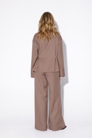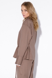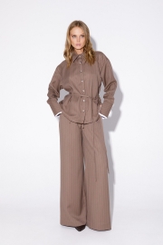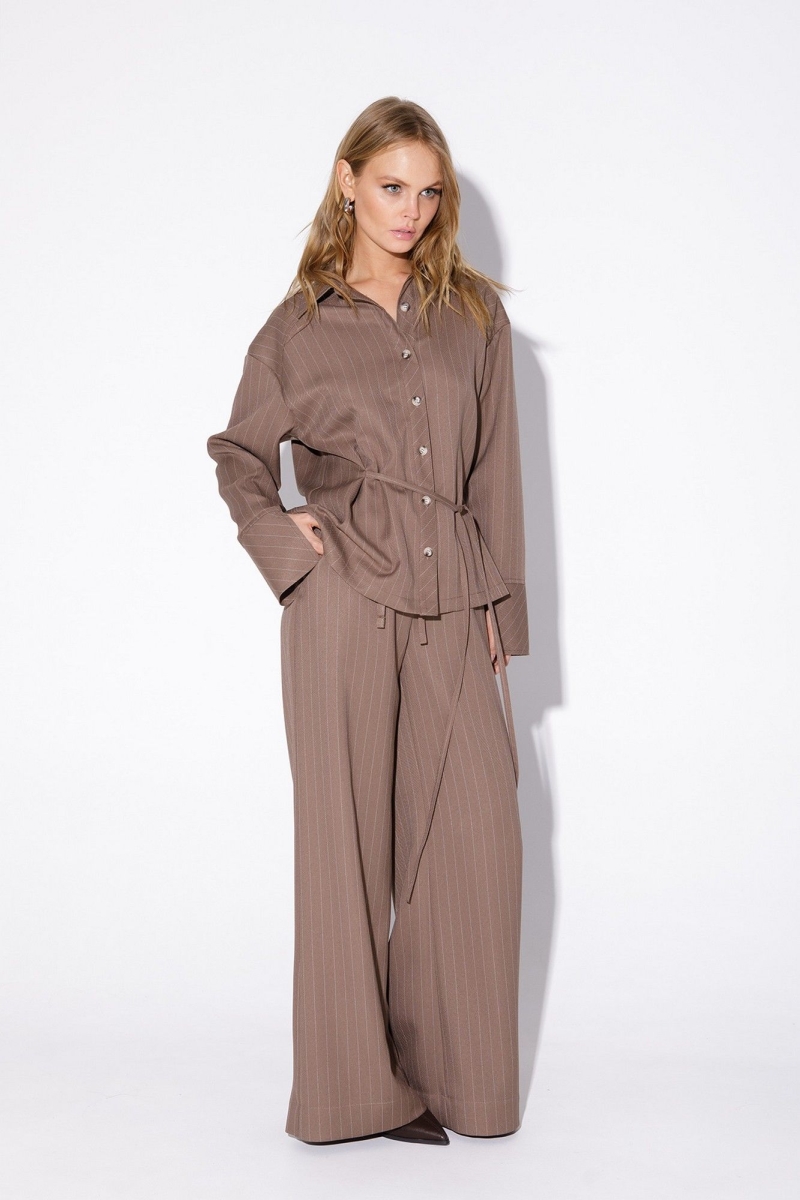 Костюм-двойка в полоску из свободной рубашки со съемными элементами и прямых широких брюк с поясом-резинкой. Детали: рубашка свободного кроя с расширенной линией плеч, рубашечный воротник, застежка на петли и пуговицы, асимметричные складки переда, длинные рукава с притачными широкими манжетами и разрезом по низу. Съемный воротник и манжеты. Брюки на притачном поясе с резинкой, без застежки, боковые карманы. Длина рубашки по спинке около 62 см в размерах 40-46 и около 65 см в размерах 48-52, длина рукава+ плечо около 56+4 см. Длина брюк по боковому шву с поясом около 107 см в размерах 40-46 и около 108 см в размерах 48-52, длина по внутреннему шву около 79 см