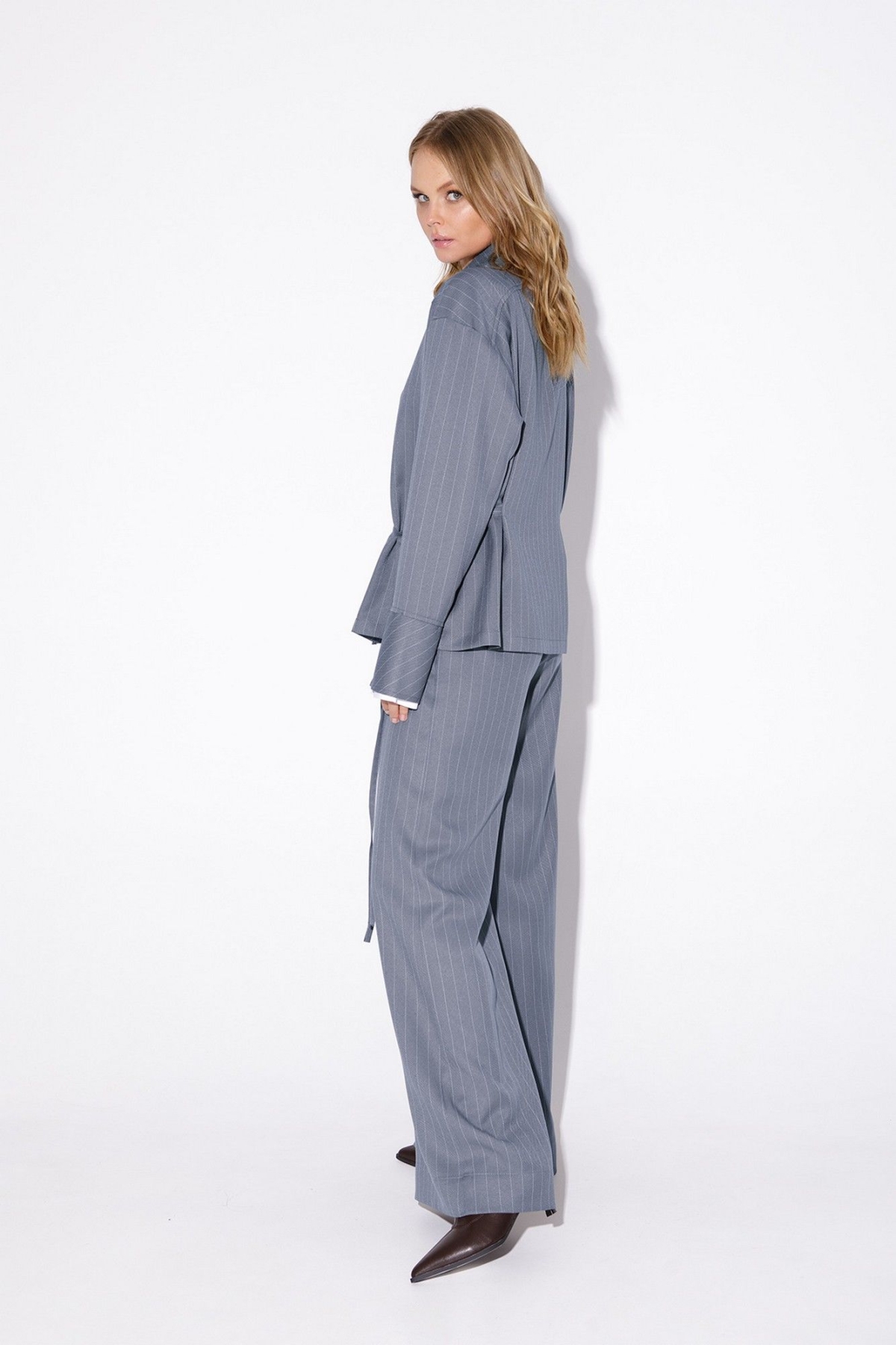 Костюм-двойка в полоску из свободной рубашки со съемными элементами и прямых широких брюк с поясом-резинкой. Детали: рубашка свободного кроя с расширенной линией плеч, рубашечный воротник, застежка на петли и пуговицы, асимметричные складки переда, длинные рукава с притачными широкими манжетами и разрезом по низу. Съемный воротник и манжеты. Брюки на притачном поясе с резинкой, без застежки, боковые карманы. Длина рубашки по спинке около 62 см в размерах 40-46 и около 65 см в размерах 48-52, длина рукава+ плечо около 56+4 см. Длина брюк по боковому шву с поясом около 107 см в размерах 40-46 и около 108 см в размерах 48-52, длина по внутреннему шву около 79 см