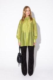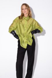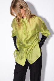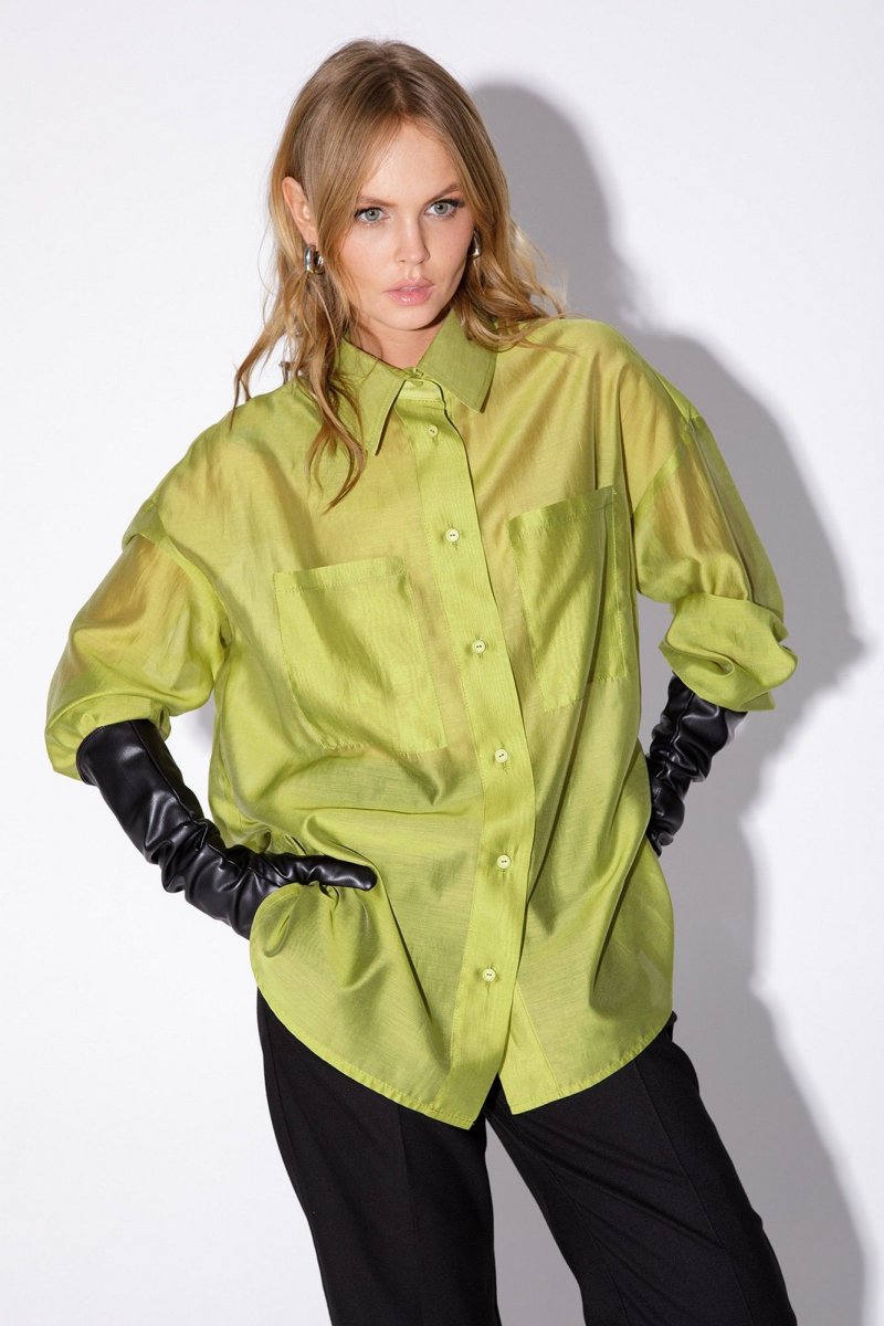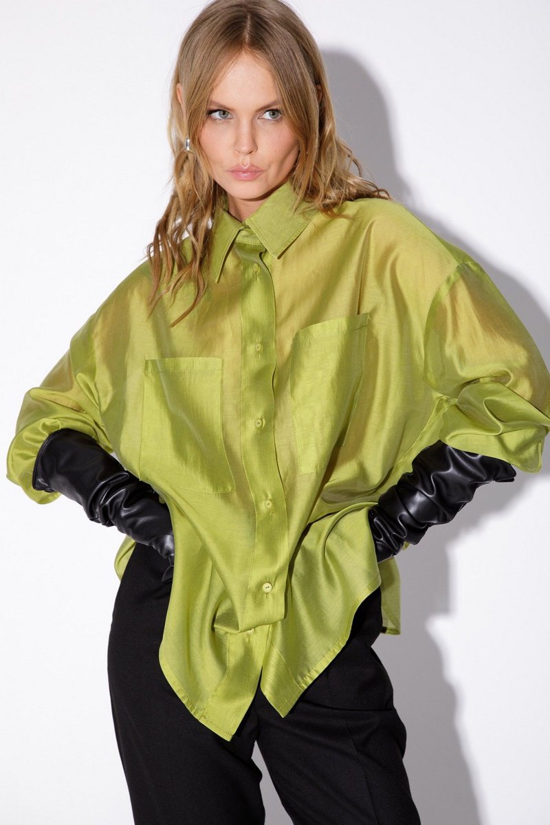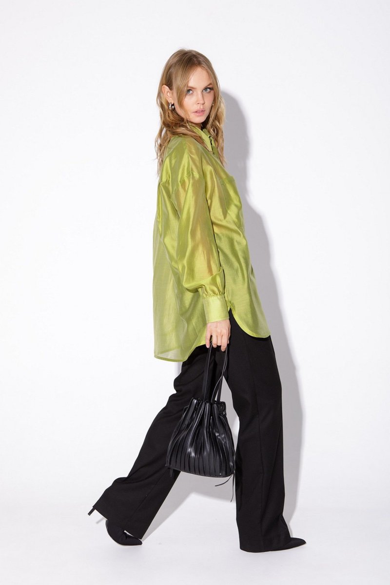 Текстильный комплект-двойка из полупрозрачной оверсайз рубашки и прямых широких брюк со стрелками.