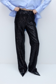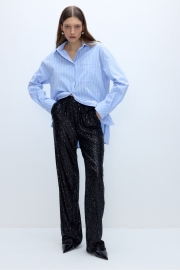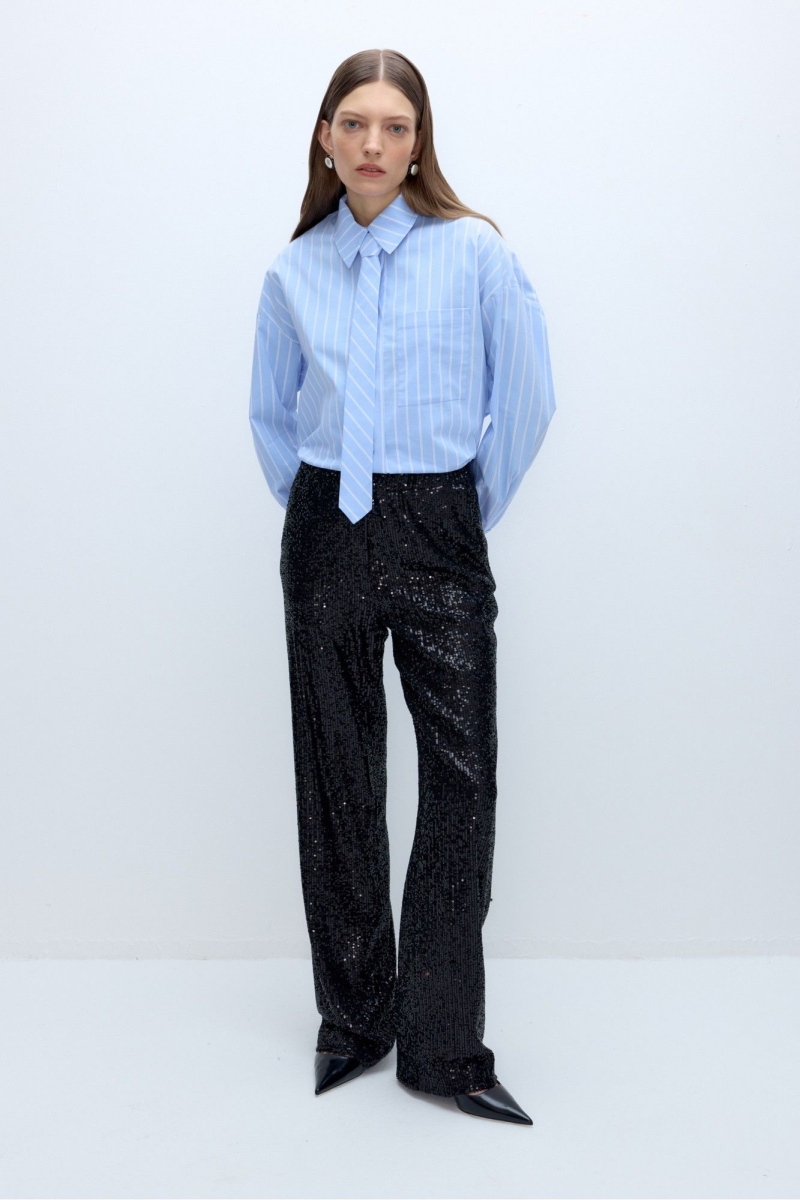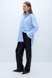 Комплект-дво йка из хлопковый оверсайз рубашки в полоску и свободных брюк в пайетки. Детали: рубашка прямого силуэта, спущенная линия плеча, застежка на петли и пуговицы, длинные рукава с притачными манжетами, фигурный низ. Брюки с высокой посадкой на притачном поясе с резинкой, боковые карманы, на подкладке. Длина рубашки по спинке около 78 см, длина рукава+ плечо около 55+9= 64 см. Длина брюк по боковому шву около 110 см в размерах 40-46 и около 112,5 см в размерах 48-52. Длина по внутреннему шву около 78 см.