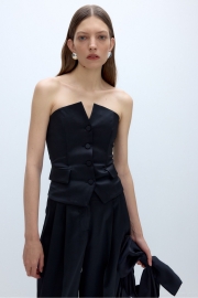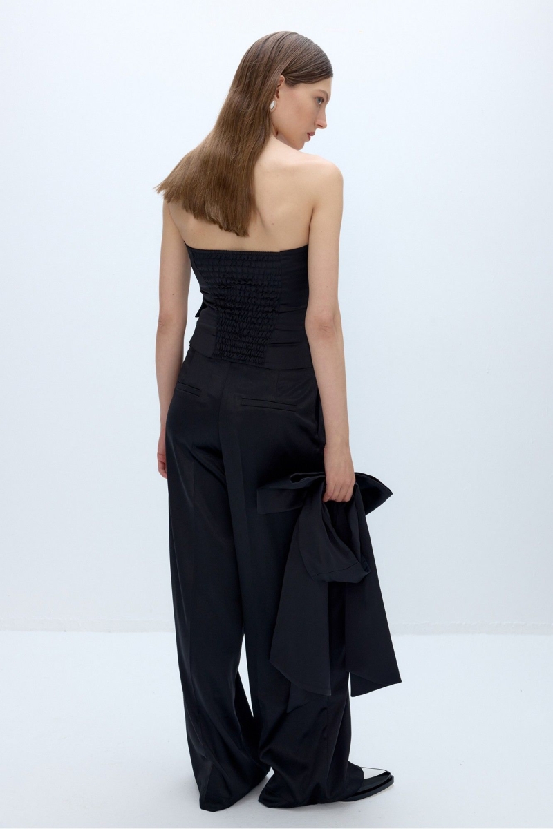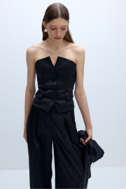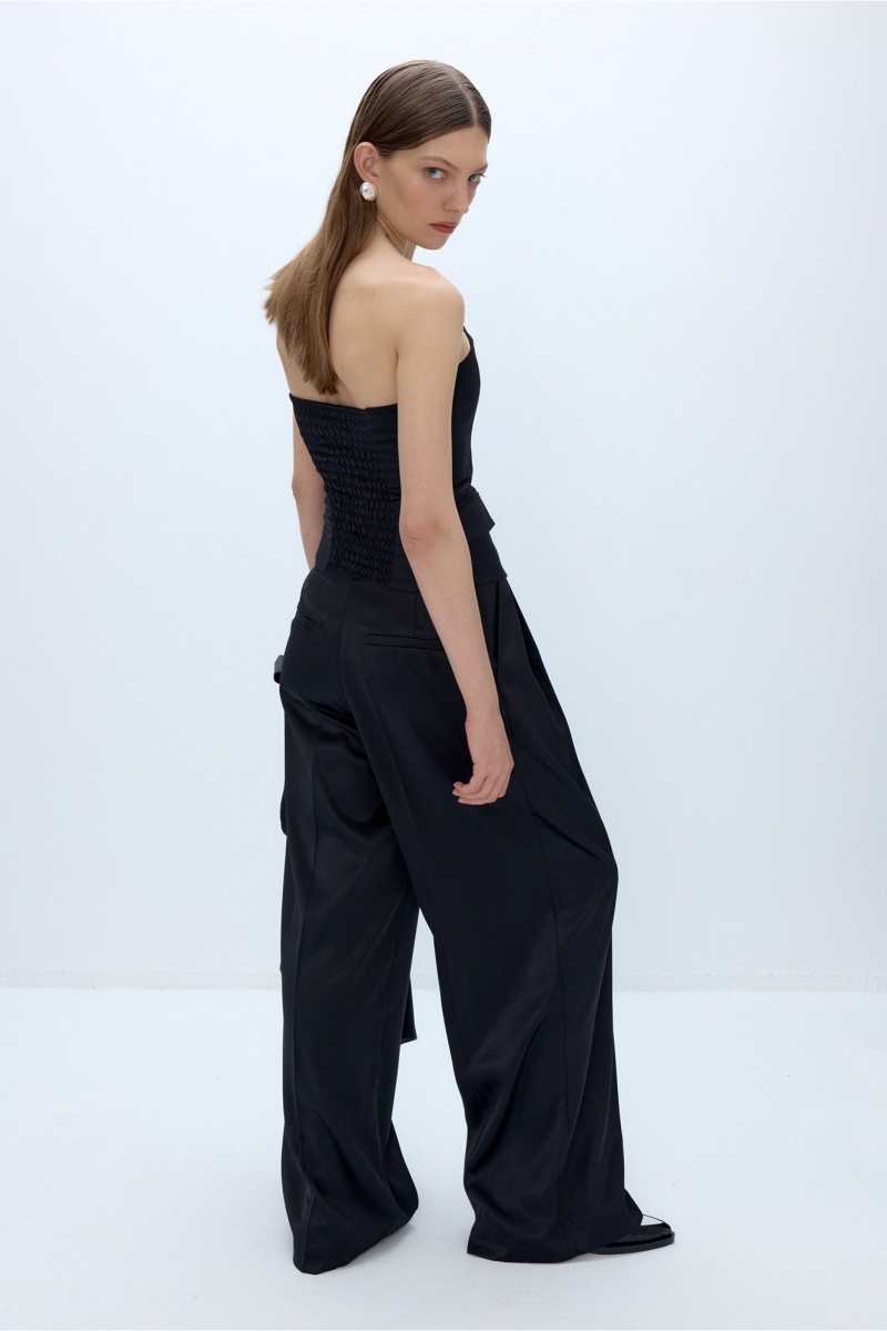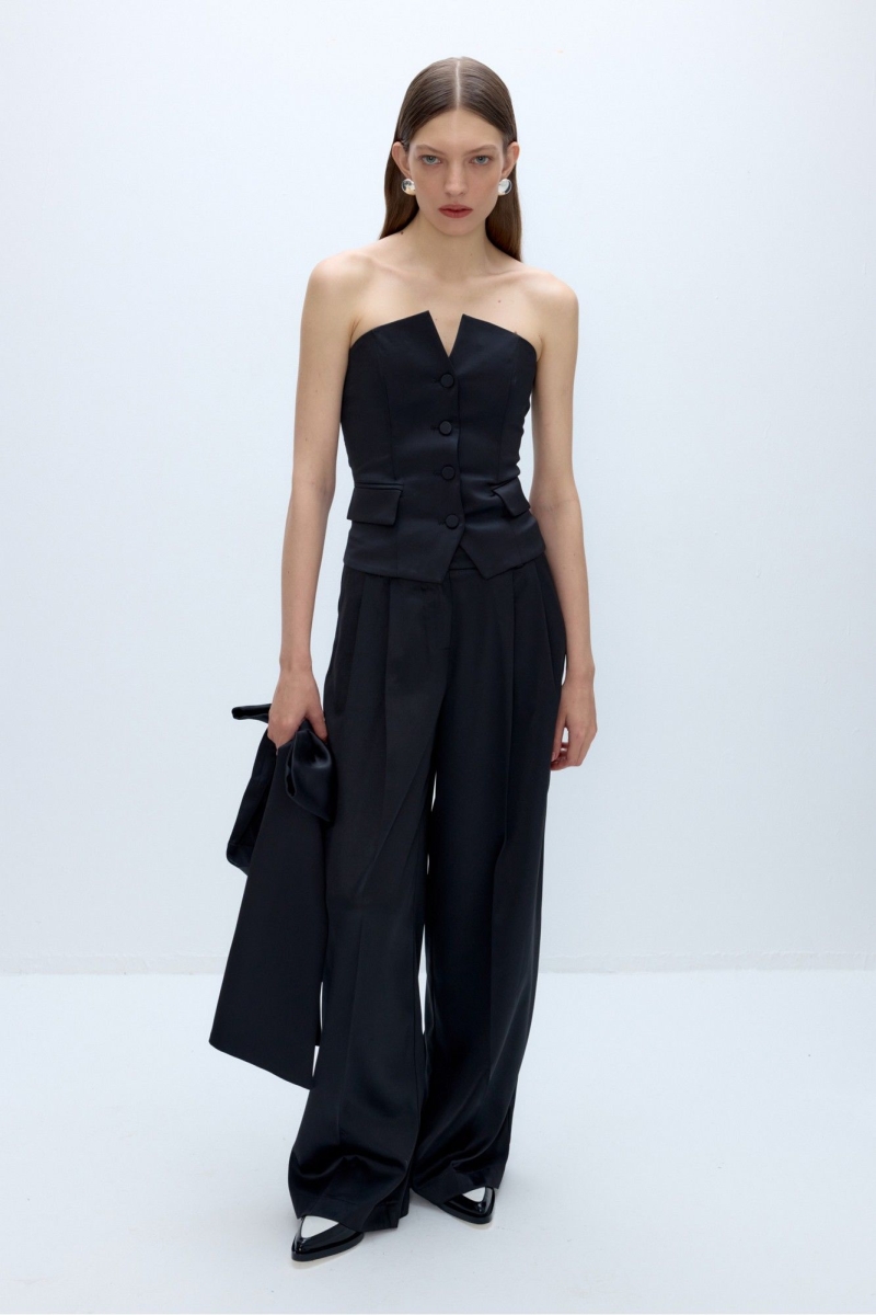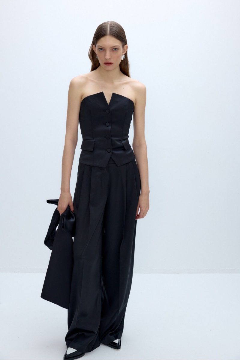 Атласный костюм-двойка из топа-корсета и брюк-палаццо. Детали: топ прилегающего силуэта, рельефные швы с регилином, функциональные карманы, застежка по переду на петли и пуговицы, спинка с эластичной вставкой, фигурный низ. Широкие брюки-палаццо с небольшими складками у пояса и заутюженными стрелками, притачной пояс со шлевками, застежка на молнию и пуговицу, боковые карманы. Задние части брюк с вытачками и имитацией карманов. Длина топа по спинке около 27,5 см в размерах 40-46 и около 29 см в размерах 48-52. Длина брюк по боковому шву с поясом около 109,5 см, длина по внутреннему шву около 83 см.
