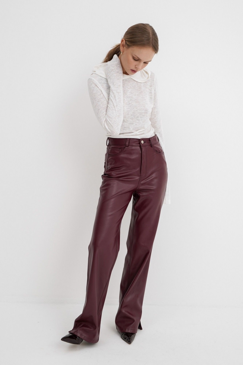 Комплект-двойка из базового лонгслива с капюшоном и прямых брюк из экокожи. Детали: лонгслив прямого силуэта, втачные удлиненные рукава. Перед и спинка удлиненные, что позволяет формировать драпировку по талии. Брюки с высокой посадкой, прилегающий силуэт, притачной пояс со шлевками, застежка на молнию и пуговицу, перед с боковыми карманами, спинка с кокеткой и двумя накладными карманами, разрезы по низу боковых швов. Изнанка экокожи с небольшим ворсом. Длина лонгслива спинке около 66 см, длина рукава около 70 см. Длина брюк по боковому шву с поясом около 110,5 см в размерах 40-46 и около 112 см в размерах 48-52 см.