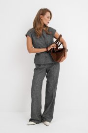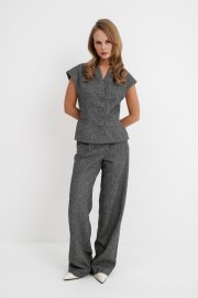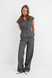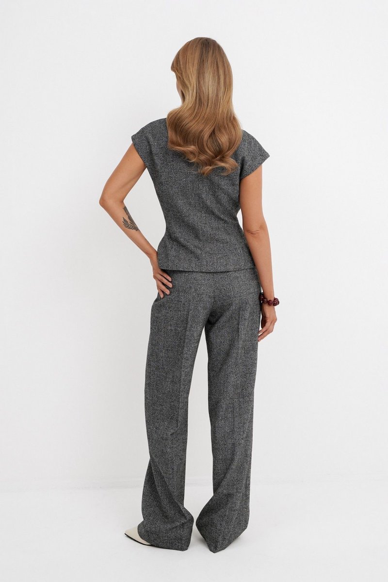 Костюм-двойка из приталенного жилета с воротником-стойкой и широких прямых брюк из меланжевой текстильной ткани.
