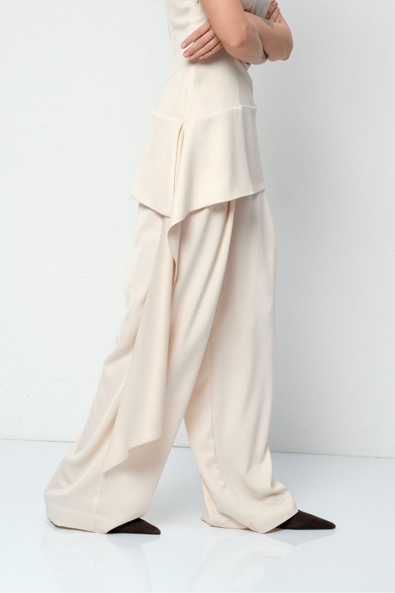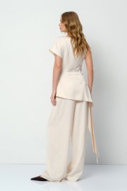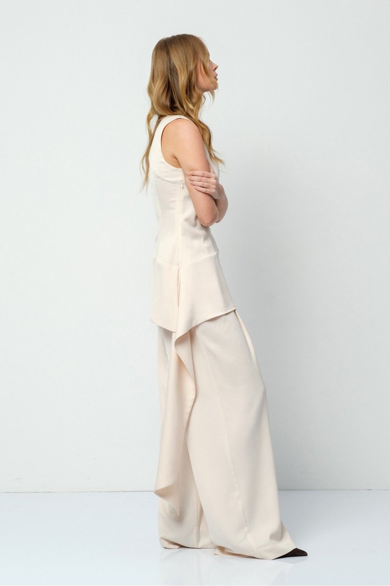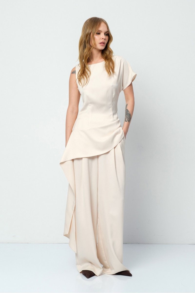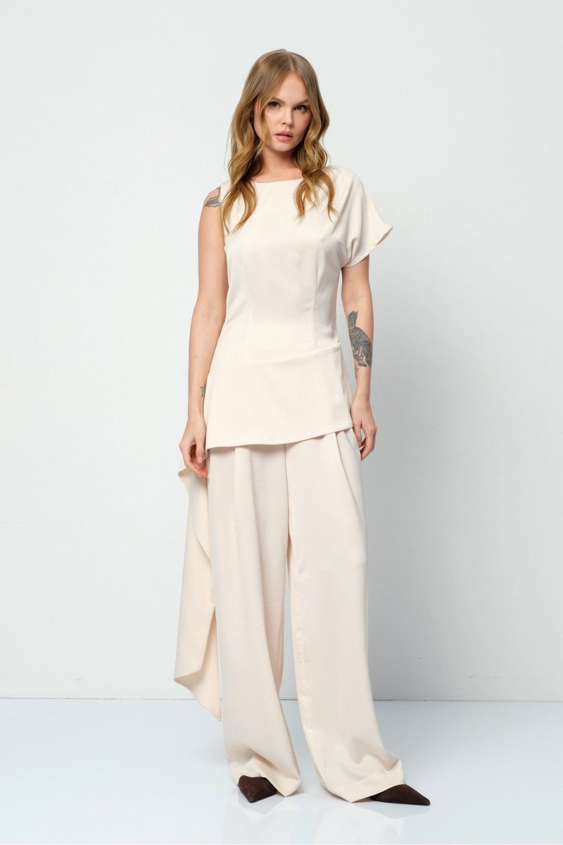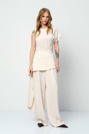 Детали: туника приталенного силуэта, широкая горловина переда и спинки, талиевые вытачки, фигурный низ, потайная застежка-молния в среднем шве спинки. Брюки с высокой посадкой, передние половины брюк с двумя складками, эластичный пояс-резинка, боковые карманы, без застежки.
