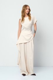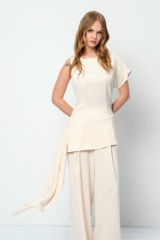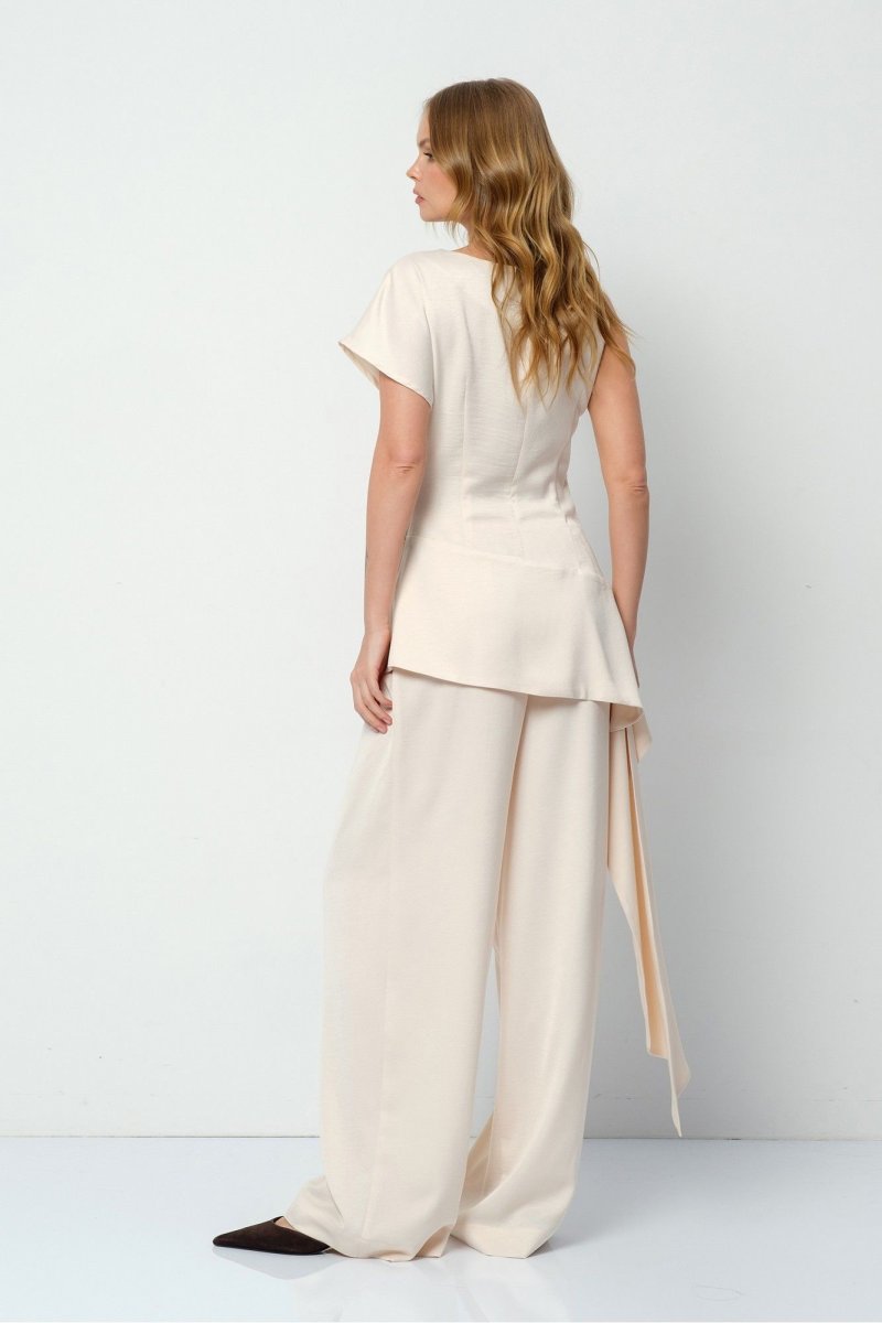 Атласный костюм-двойка из приталенной асимметричной блузы и широких брюк.