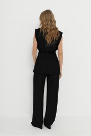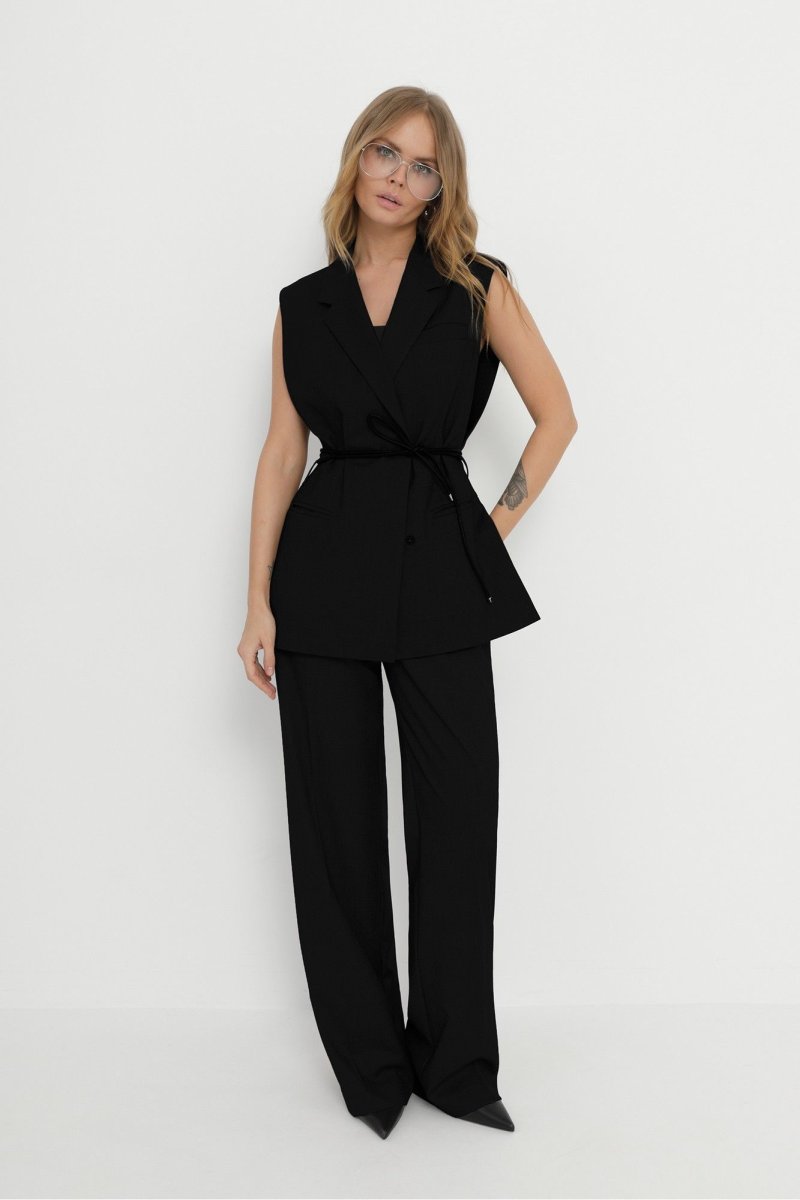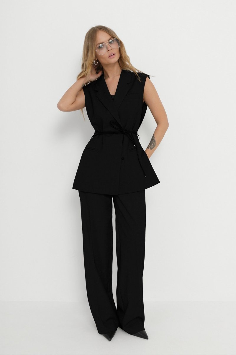 Костюм-двойка из прямого жилета и широких брюк со стрелками.