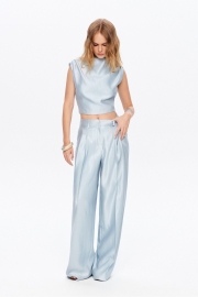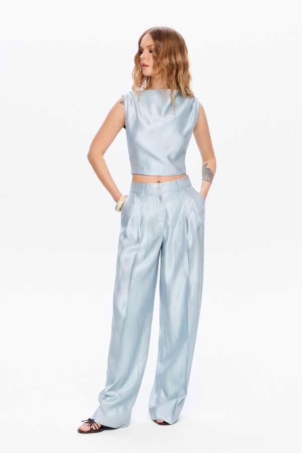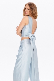 Костюм-двойка из топа с открытой спинкой и брюк-палаццо. Детали: полуприлегающий силуэт, вырез переда- «качели», топ на подкладке, при помощи поясов можно регулировать прилегание. Также пояса можно завязать спереди. Брюки с притачным поясом со шлевками, складки у пояса, застежка на молнию и пуговицу, боковые карманы. Задние части брюк с вытачками и имитацией карманов. Длина топа по спинке около 42 см в размерах 40-46 и около 43,5 см в размерах 48-52. Длина брюк по боковому шву с поясом около 109 см, длина по внутреннему шву около 82 см