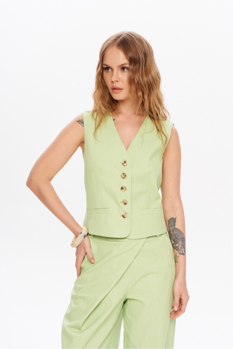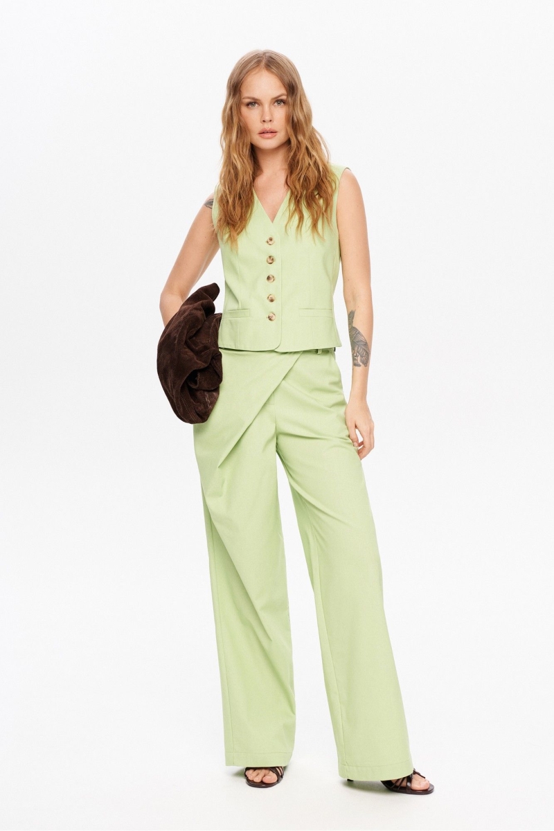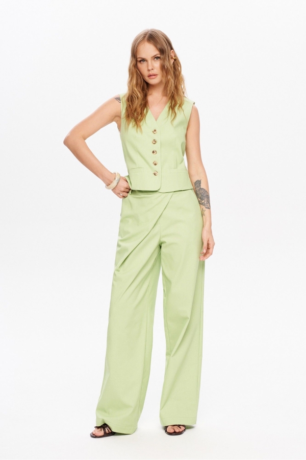 Льняной костюм-двойка из свободного жилета полуприлегающего силуэта и асимметричных прямые брюки на запа́х. Детали: жилет с талиевыми вытачками, спинка со средним швом и рельефами, застежка на петли и пуговицы, функциональные карманы, на подкладке 100% хлопок, прилегание по талии регулируется хлястиками на спинке. Брюки с притачным поясом со шлевками, застежка на молнию и пуговицу, боковые карманы. Задние части брюк с вытачками, пояс без резинки. Длина жилета по спинке около 46 см в размерах 40-46 и около 49 см в размерах 48-52. Длина брюк по боковому шву с поясом около 108 см, длина по внутреннему шву около 79 см
