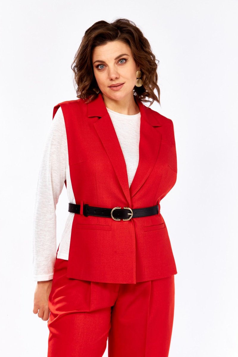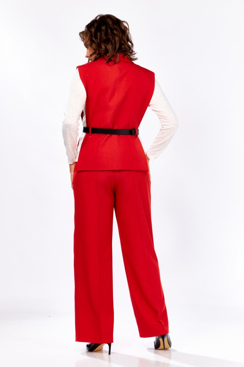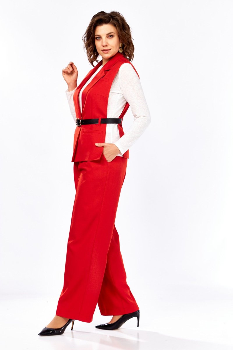 Женский костюм с жилетом и брюками-палаццо Элегантный костюм, созданный для уверенных и стильных женщин, которые ценят комфорт и изысканность. - Жилет: приталенный крой подчёркивает линии силуэта, а V-образный вырез визуально удлиняет шею и делает образ более утончённым. Застёжка на потайные кнопки добавляет аккуратности и минимализма. - Брюки-палаццо: свободный фасон корректирует фигуру, подходит для строгого дресс-кода и дарит ощущение лёгкости. Вертикальные линии по центру брючин вытягивают силуэт и визуально удлиняют ноги. - Детали: верх брюк выполнен на притачном поясе с классической застёжкой — молния и пуговица. В комплект входит съёмный пояс, который позволяет менять акценты и создавать новые образы. Этот костюм — идеальное решение для деловых встреч, офисного стиля и торжественных мероприятий. Он подчеркнёт вашу индивидуальность, добавит элегантности и станет универсальной базой гардероба. измерения измерения изделия в готовом виде, см 46 48 50 ширина по груди переда жилета 35,5 36 36,5 ширина по груди спинки жилета 39,5 40 40,5 ширина по низу переда жилета 42,5 43 43,5 ширина по низу спинки жилета 41,5 42 42,5 ширина по талии переда жилета 36 36,5 37 ширина по талии спинки жилета 36 36,5 37 длина плеча 14,5 14,5 14,5 Длина по спинке жилета 60 60 60 Длина брюк по боковому шву 102 102 102 полуобхват талии 38 41 43 полуобхват бедер 51 53 55