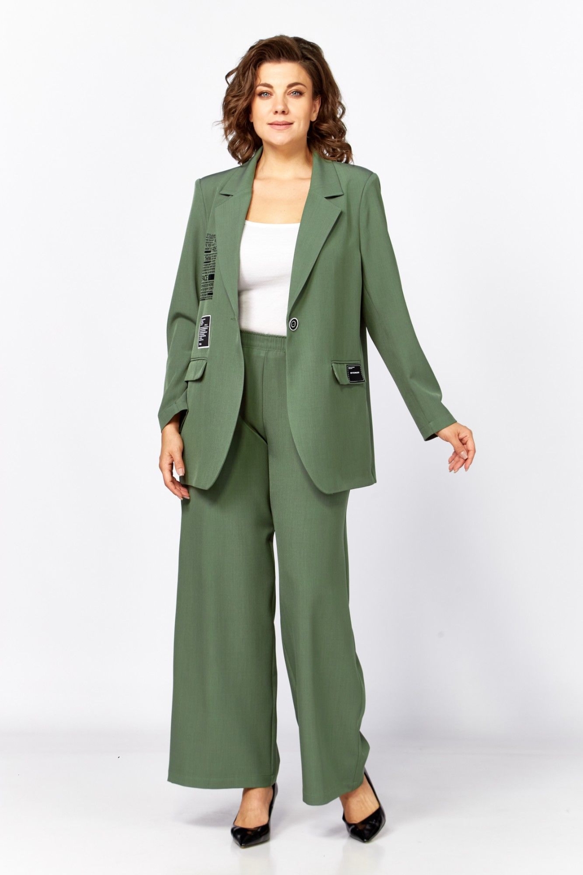 Комплект женский двухпредметный, состоящий из жакета и брюк. Стильный и непринужденный образ, который подчеркнет хрупкость и утонченность, скроет несовершенства фигуры. Комплект отлично подойдет как для повседневной носки, так и для праздничных выходов, достаточно дополнить его соответствующими аксессуарами. Предметы комплекта легко будут сочетаться с вещами из Вашего гардероба.