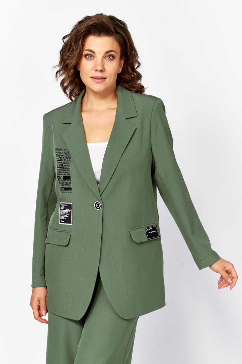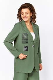 Жакет с центральной застежкой на петли-пуговицы полуприлегающего силуэта. Перед на подкладке, в жакете прорезные карманы с клапаном, воротник пиджачного типа. По переду настрочены декоративные нашивки. Рукав втачной, одношовный.