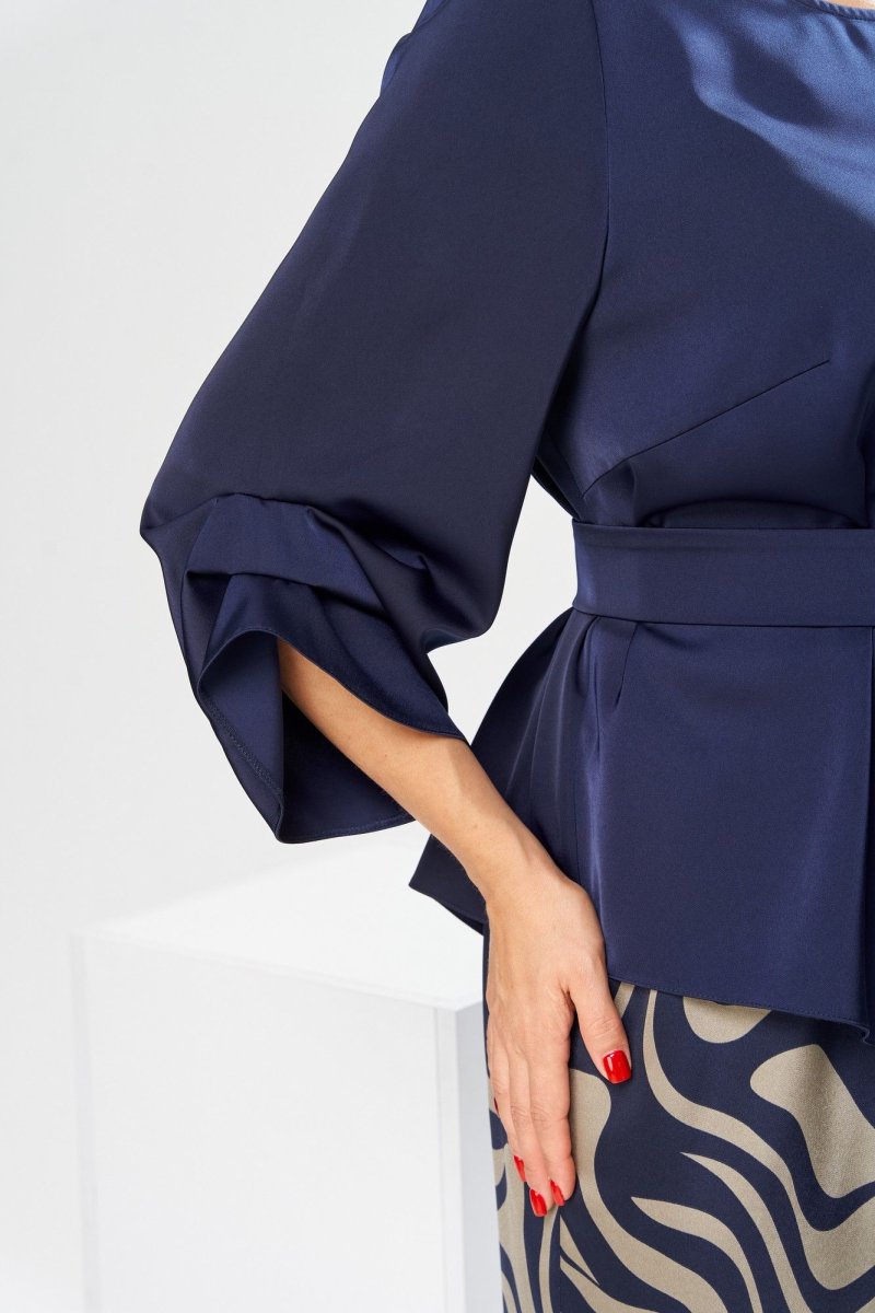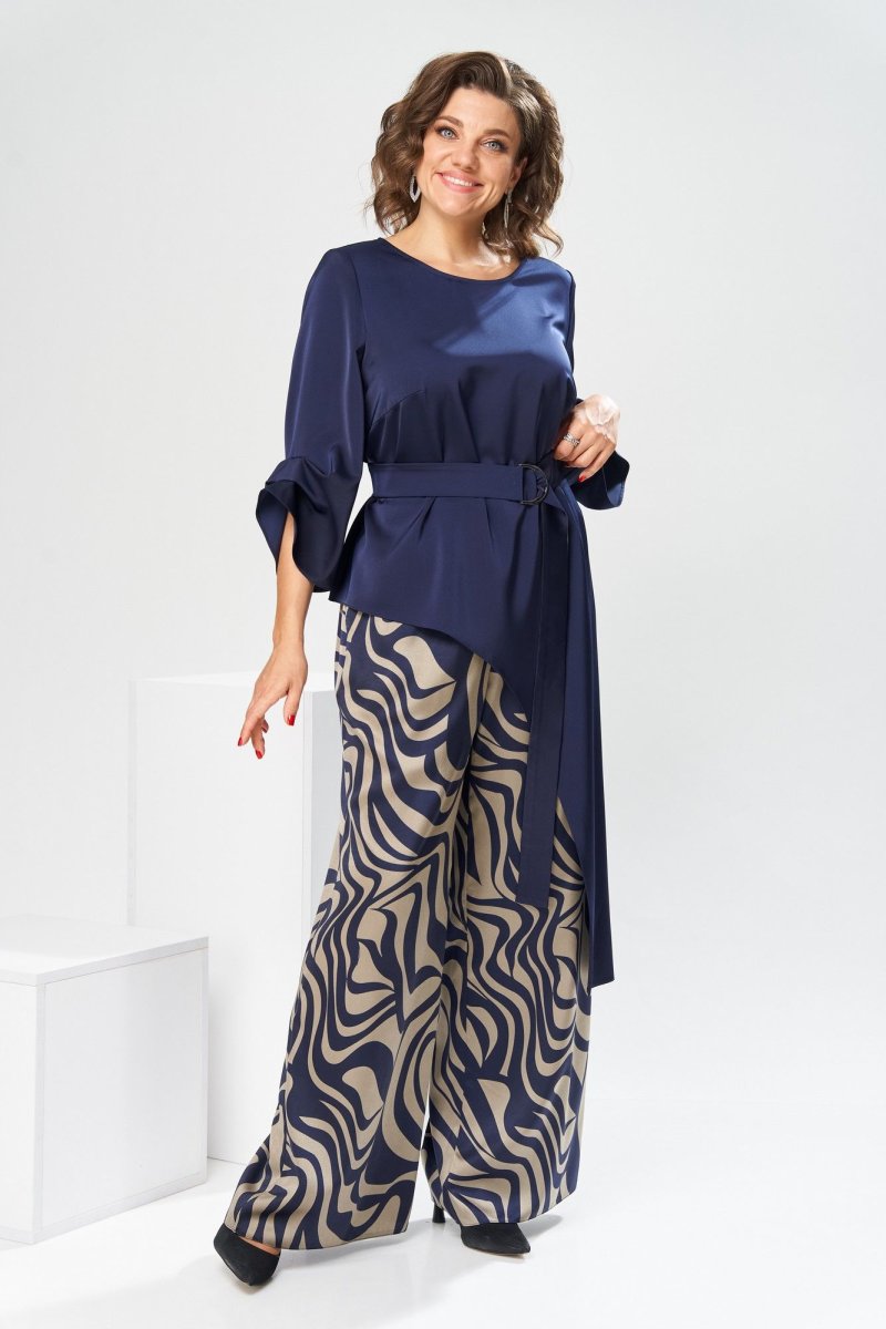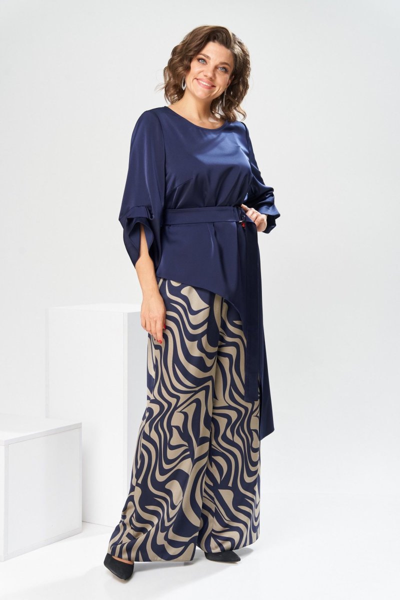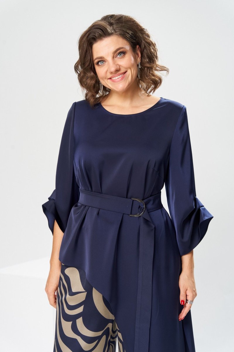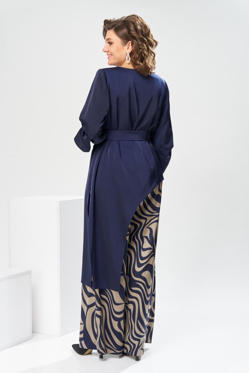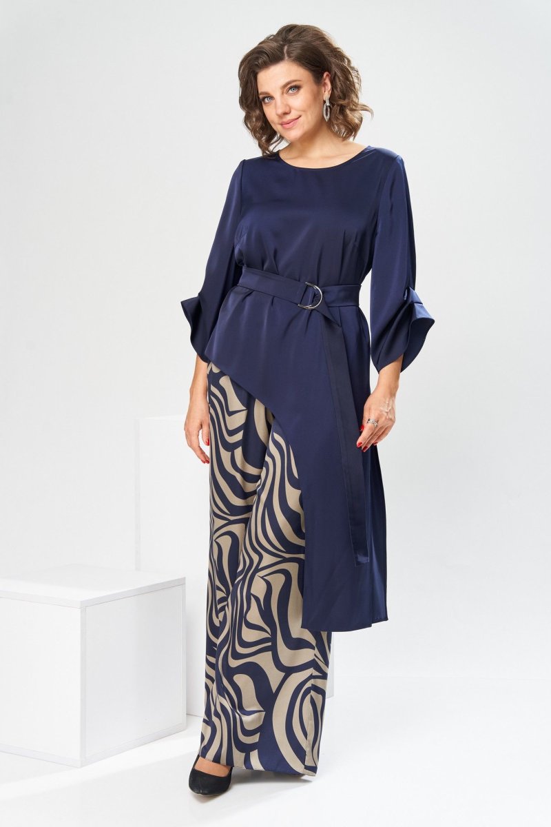 Костюм женский относится к торжественной одежде. Костюм женский 2-х предметный туника и брюки. Туника прямого силуэта, длиной до середины икры с ассиметричным подрезом переда и спинки. Перед с 2-мя нагрудными вытачками. Спинка цельнокроеная. Горловина круглая, обточная, без воротника. Рукав втачной, одно шовный, длиной 3/4, с 2-мя декоративными защипами, внизу шириной 3 см. Туника с плечевыми накладками. Брюки женские прямые длинные. Передние половинки с карманами в боковых швах. Задние половинки с таллиевыми вытачками. Брюки с притачным поясом, собранным на эластичную тесьму, закреплённую 2-мя отделочными строчками. К костюму прилагается съёмный пояс, фиксирующийся на металлическую пряжку. Длина брюк по боковому шву 105 см. Длина спинки туники 61 см, длина рукава 40,5 см.
