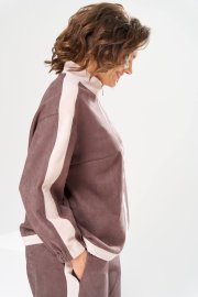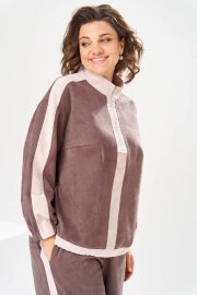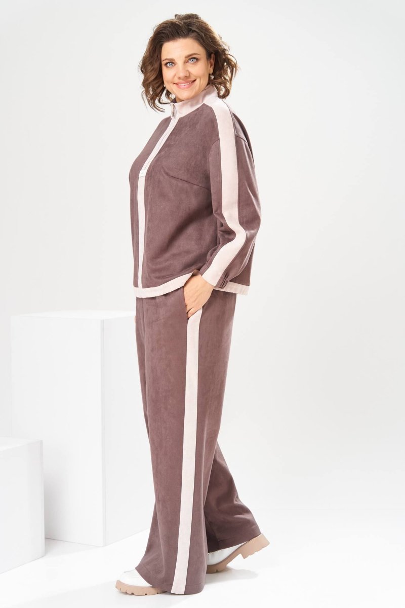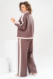 Костюм женский предназначен для повседневной носки. Костюм женский спортивного типа, 2-х предметный джемпер и брюки. Джемпер женский прямого силуэта, длиной до линии бёдер. Перед с 2-мя нагрудными выточками, с вертикальной планкой по центру из отделочной ткани. Спинка цельнокроенная. Горловина круглая с втачной стойкой из отделочной ткани. Застёжка на втачную металлическую молнию, по центру вертикальной планки переда, переходящую на стойку, низ молнии декорирован настрочной аппликацией. Джемпер со спущенным плечом. Рукав втачной длинный, низ рукава собран на эластичную тесьму; по центру рукава вертикальная притачная планка из отделочной ткани переходящая на плечо. Низ с притачной горизонтальной планкой с кулисой с 2-мя фиксаторами и эластичной тесьмой, регулирующей ширину джемпера по низу. Брюки женские, прямые длинные. Передние половинки с карманами в боковых швах. Задние с притачными вертикальными планками из отделочной ткани. Брюки с притачным поясом, собранным на эластичную тесьму, закреплённую 2-мя отделочными строчками. Длина спинки джемпера 62 см, ширина плеча+длина рукава 72 см. Длина брюк по боковому шву без пояса 104 см, длина брюк по шаговому шву 76,5 см.
