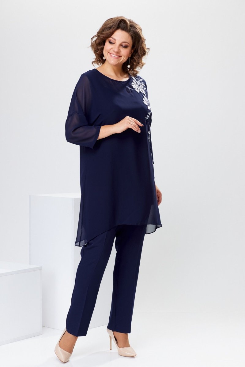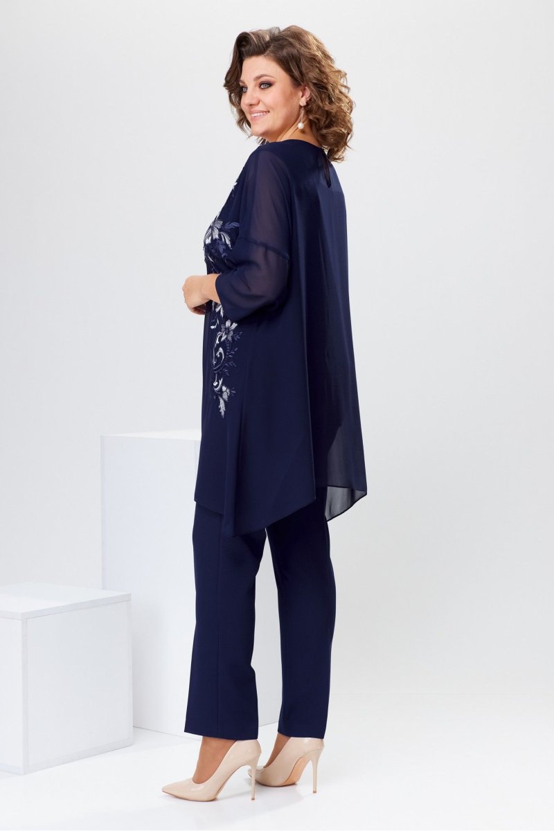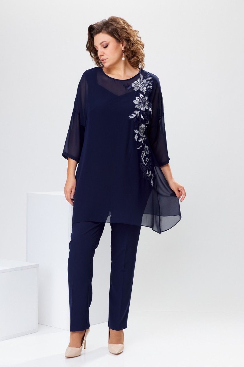 Комплект женский относится к нарядной торжественной одежде. Комплект женский трехпредметный: блузка, топ и брюки. Блузка женская прямого силуэта, с фигурным низом, со спущенной проймой. Перед цельнокроеный, декорирован кружевом. Спинка цельнокроеная. Горловина круглая, обтачная, без воротника. Рукав одно шовный, длиной 7/8. Топ женский, длиной до линии бедер. Перед цельнокроеный, с двумя нагрудными вытачками. Спинка цельнокроеная. Горловина фигурная, обтачная. Бретели широкие обтачный. Брюки длинные, слегка заужены книзу. Передние и задние половинки с двумя талиевыми вытачками. Застежка на тесьму-молнию. Верхний срез с притачным поясом, застегивающимся на одну обметанную петлю и одну пришивную пуговицу. Между боковым швом и вытачкой на задних половинках собран на эластичную тесьму. Длина топа 57 см. Длина блузки 79.5 см, длина рукава 57-58-59 см соответственно. Длина брюк 102 см.